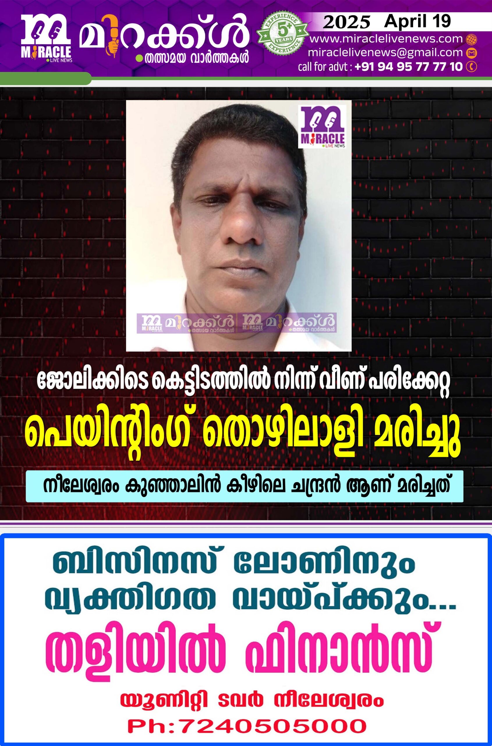 ജോലിക്കിടെ കെട്ടിടത്തില്‍ നിന്ന് വീണ് പരിക്കേറ്റ പെയിന്റിംഗ് തൊഴിലാളി മരിച്ചു;  നീലേശ്വരം കുഞ്ഞാലിന്‍ കീഴിലെ ചന്ദ്രന്‍ ആണ് മരിച്ചത്