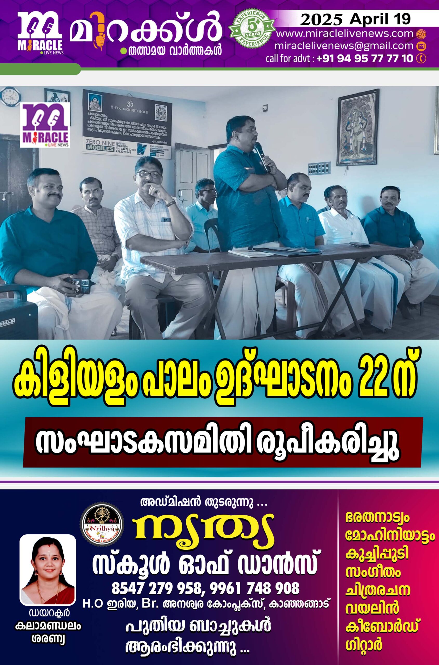 നീലേശ്വരം : കിനാനൂര് കരിന്തളം പഞ്ചായത്തിലെ കിളിയളം പാലത്തിന്റെ ഉദ്ഘാടനം ഏപ്രില് 22 ന് ചൊവ്വാഴ്ച 11 മണിക്ക് പൊതുമരാമത്ത് വകുപ്പ് മന്ത്രി പി എ മുഹമ്മദ് റിയാസ് നിര്വ്വഹിക്കും. ഈ ചന്ദ്രശേഖരന്, രാജ്മോഹന് ഉണ്ണിത്താന് തുടങ്ങിയ ജനപ്രതിനിധികള് പരിപാടിയില് സംബന്ധിക്കും. കിളിയളം കോവിലില് പരിസരത്ത് ചേര്ന്ന സംഘാടകസമിതി യോഗം ആരോഗ്യ വിദ്യാഭ്യാസ സ്റ്റാന്ഡിങ് കമ്മിറ്റി ചെയര്മാന് കെ.വി അജിത്ത് കുമാറിന്റെ അധ്യക്ഷതയില് ഗ്രാമപഞ്ചായത്ത് പ്രസിഡണ്ട് ടി.കെ.രവി ഉദ്ഘാടനം ചെയ്തു. വിനോദ് കുമാര് കെ.പി, കെ ലക്ഷ്മണന്,എന് പുഷ്പരാജന്, ബാനം കൃഷ്ണന്, അബ്ദുള് നാസര് സി എച്ച്, കെ.ഗോപാലകൃഷ്ണന് , കെ യശോദ, ഏ ആര് രാജു, കെ ബാലചന്ദ്രന് ,ടി.വി ബാബു തുടങ്ങിയവര് സംസാരിച്ചു.ചെയര്മാന് ടി.കെ രവി ജനറല് കണ്വീനര് വിനോദ് കുമാര് കെ.പി കണ്വീനര് അജിത്ത്കുമാര്കെ.വി
