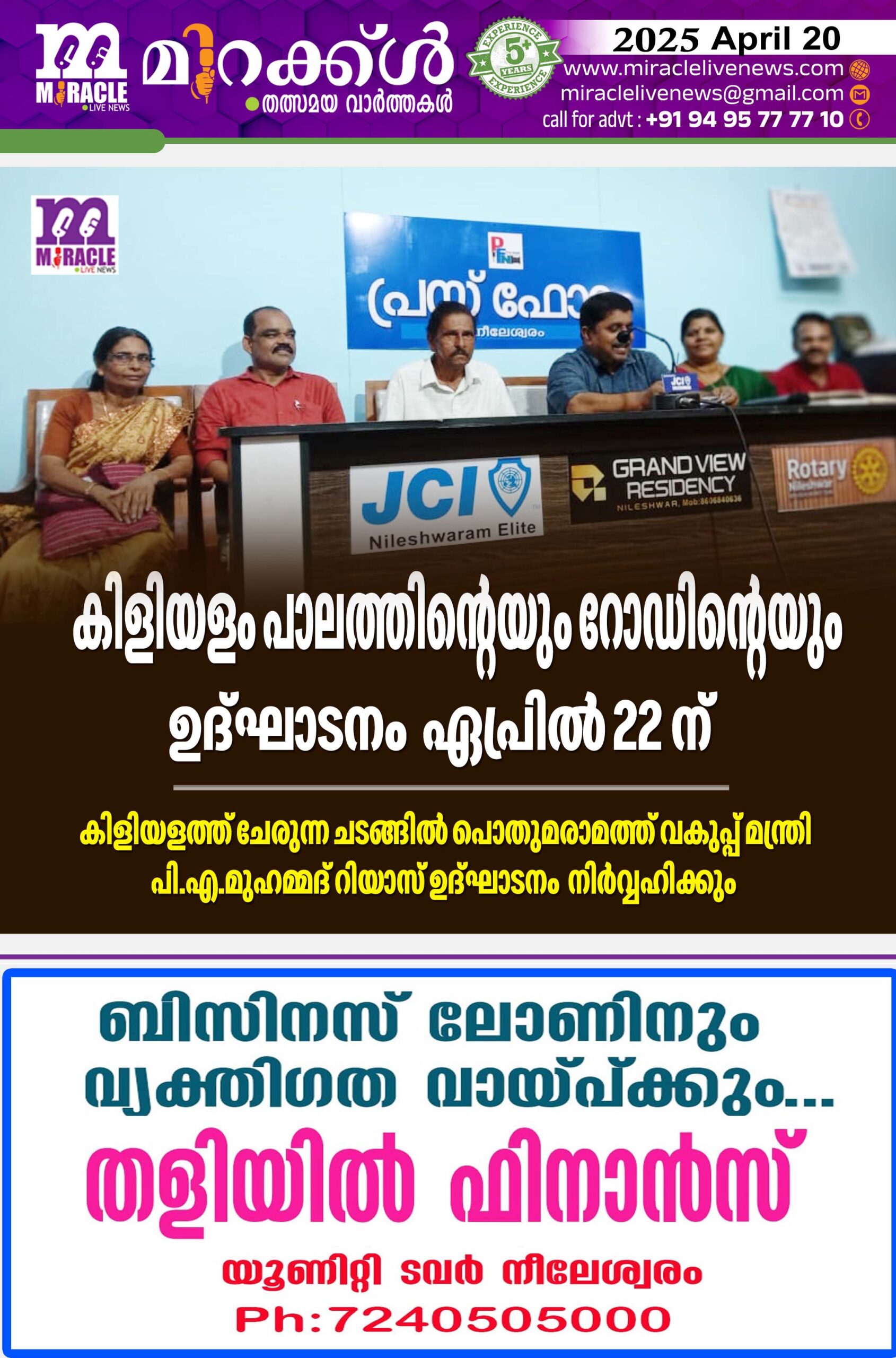 കിളിയളം പാലത്തിന്റെയും റോഡിന്റെയും ഉദ്ഘാടനം ഏപ്രില് 22 ന്; കിളിയളത്ത് ചേരുന്ന ചടങ്ങില് പൊതുമരാമത്ത് വകുപ്പ് മന്ത്രി പി.എ.മുഹമ്മദ് റിയാസ് ഉദ്ഘാടനം നിര്വ്വഹിക്കും