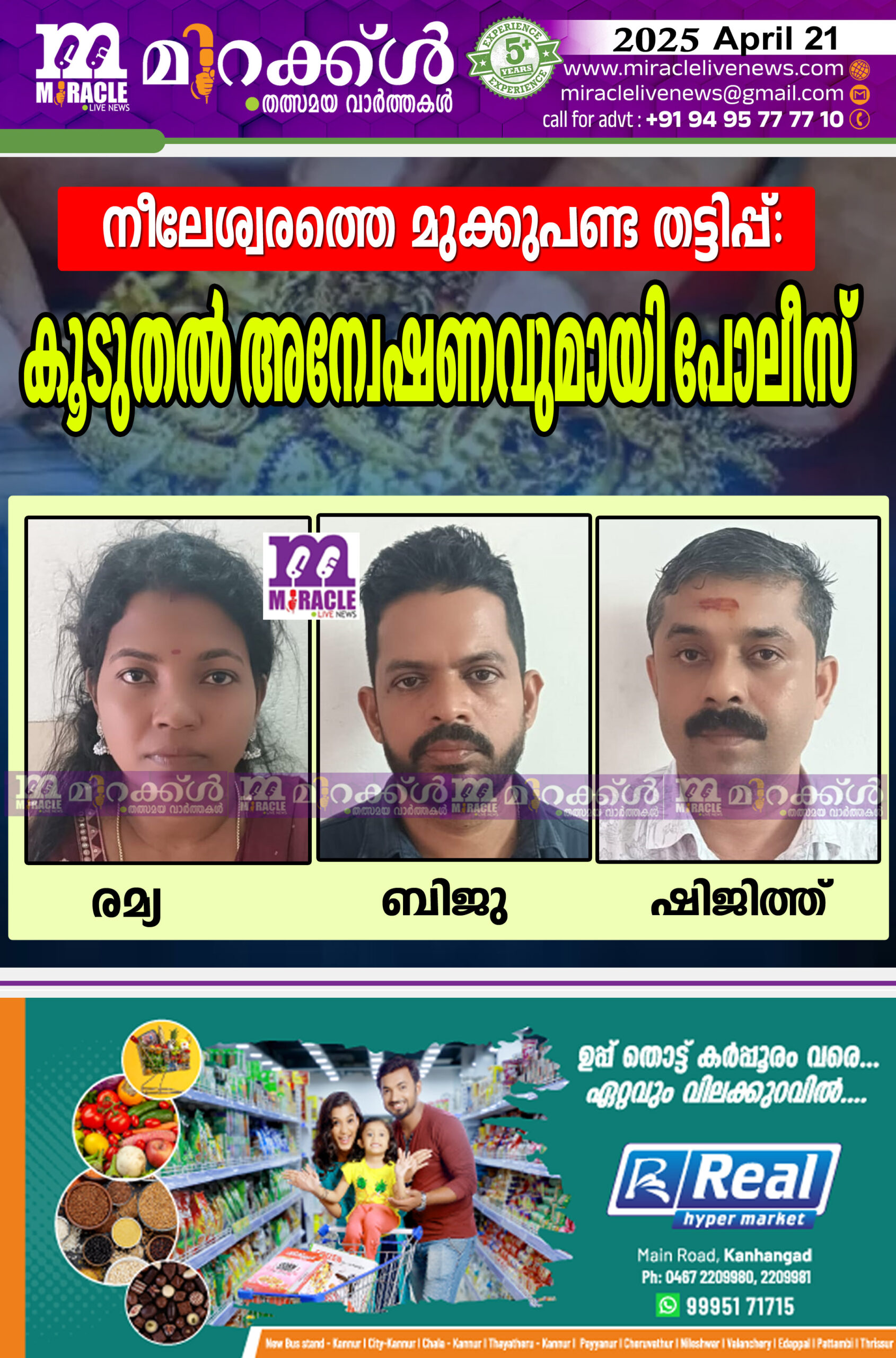 നീലേശ്വരം: 916 മുദ്രയുള്ള മുക്കുപണ്ടം പണയപ്പെടുത്തി പണം തട്ടാന് ശ്രമിച്ച സംഭവത്തില് നീലേശ്വരത്തെ ജ്വല്ലറി ഉടമ ഉള്പ്പെടെ മൂന്നുപേര് റിമാന്ഡിലായ സംഭവത്തില് കൂടുതല് സ്ഥലങ്ങളില് തട്ടിപ്പ് നടന്നിട്ടുണ്ടോ എന്ന സംശയത്തില് അന്വേഷണം ശക്തമാക്കി പോലീസ്. കരിന്തളം വാളൂരിലെ പ്രസാദിന്റെ ഭാര്യയും നീലേശ്വരത്തെ കടയിലെ സെയില്സ് ഗേളുമായ രമ്യ, കണ്ണൂര് ഇരിട്ടി പടിയൂര് സ്വദേശിയും ചെറുവത്തൂര് പുതിയകണ്ടത്ത് താമസക്കാരനുമായ ഷിജിത്ത് എന്നിവരെയാണ് നീലേശ്വരം എസ്ഐ കെ.വി. രതീഷിന്റെ നേതൃത്വത്തിലുള്ള അന്വേഷണ സംഘം കഴിഞ്ഞ ദിവസം അറസ്റ്റ് ചെയ്തത്. ഇവരെ ചോദ്യം ചെയ്തതിന്റെ അടിസ്ഥാനത്തില് മുക്കുപണ്ടത്തിന് 916 മുദ്ര പതിപ്പിച്ച് നല്കിയ നീലേശ്വരം രാജാ റോഡില് താര കോംപ്ലക്സില് പ്രവര്ത്തിക്കുന്ന ദേവനന്ദ ഗോള്ഡ് ഉടമയും കണ്ണൂര് അഞ്ചരക്കണ്ടി സ്വദേശിയുമായ ബിജുവിനെയും അറസ്റ്റ് ചെയ്തിരുന്നു. കോടതിയില് ഹാജരാക്കിയ മൂന്നുപേരെയും റിമാന്റ് ചെയ്തു.