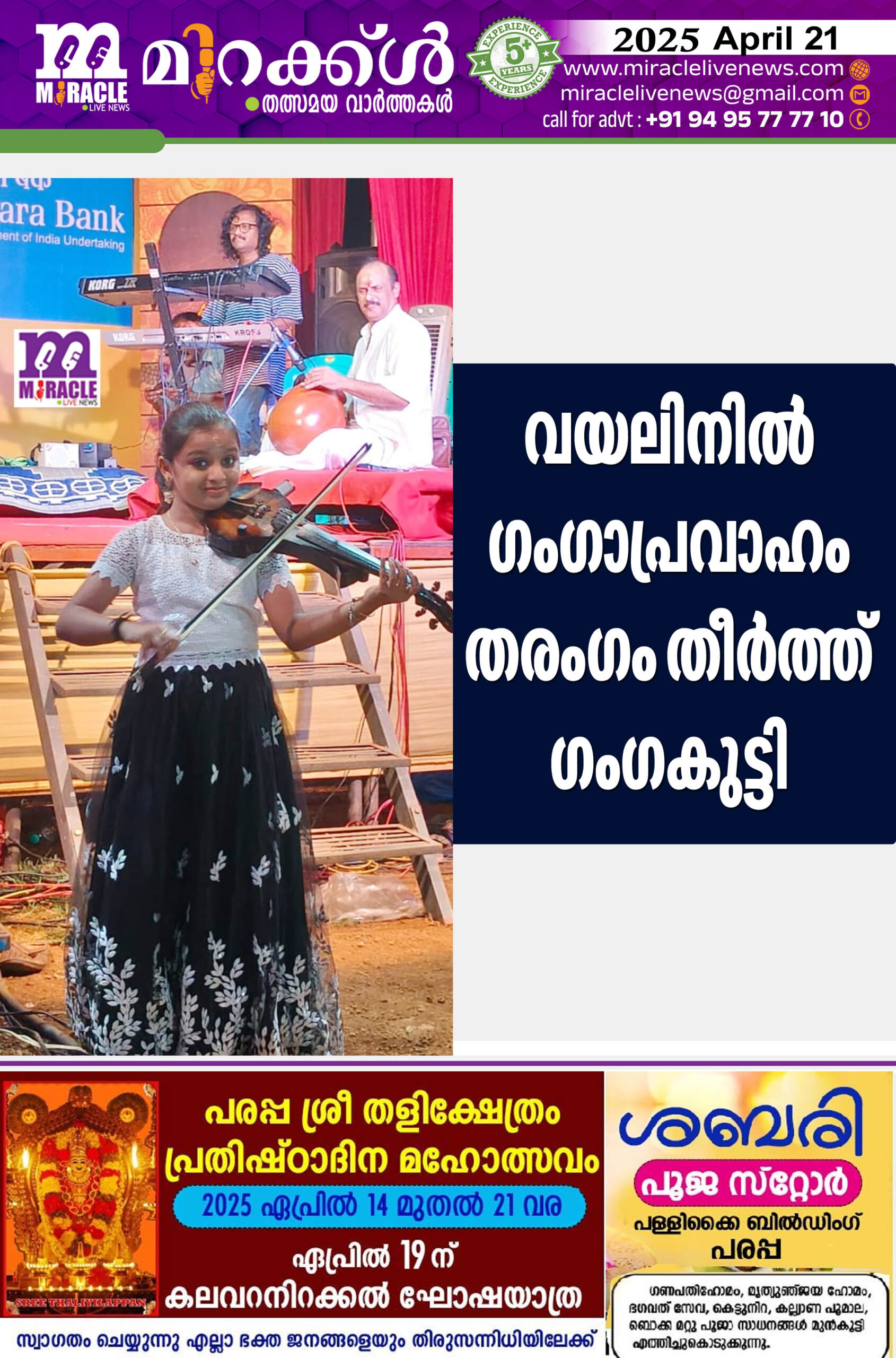 പരപ്പ :വയലിനില് ഗംഗാ തരംഗം തീര്ത്ത് സംഗീതപ്രേമികളുടെ ഹൃദയം കീഴടക്കി ഗംഗാ ശശിധരന്. പരപ്പ തളി ക്ഷേത്ര ഉത്സവത്തിന്റെ ഭാഗമായിട്ടാണ് പതിനൊന്ന് വയസുകാരി ഗംഗാ ശശിധരന് നയിച്ച വയലിന് ഫ്യൂഷനാണ് ക്ഷേത്ര സന്നിധിയില് എത്തിയവരുടെ മനസും കാതും കവര്ന്നത്. ഗംഗ വയലിനിലൂടെ സംഗീതം ഉതിരുമ്പോള് കുഞ്ഞു മുഖത്ത് വിരിയുന്ന നിഷ്കളങ്ക ഭാവങ്ങള് സംഗീത ആരാധകരുടെ മനസിനെ പിടിച്ചെടുക്കുന്നു. സാമൂഹ്യ മാധ്യമങ്ങളില് ഗം ഗയുടെ സംഗീതവും ഭാവപ്രകടനങ്ങളും ഇതിനകം വൈറലാവുകയാണ്. നാലര വയസ്സില് വയലിന് പഠനം ആരംഭിച്ച ഗംഗ, ഇന്ത്യക്ക് അകത്തും പുറത്തുമായി ഇരുന്നൂറിലധികം വേദികളില് വയലിന് കച്ചേരി അവതരിപ്പിച്ച് പ്രശംസ നേടിയിട്ടുണ്ട്.