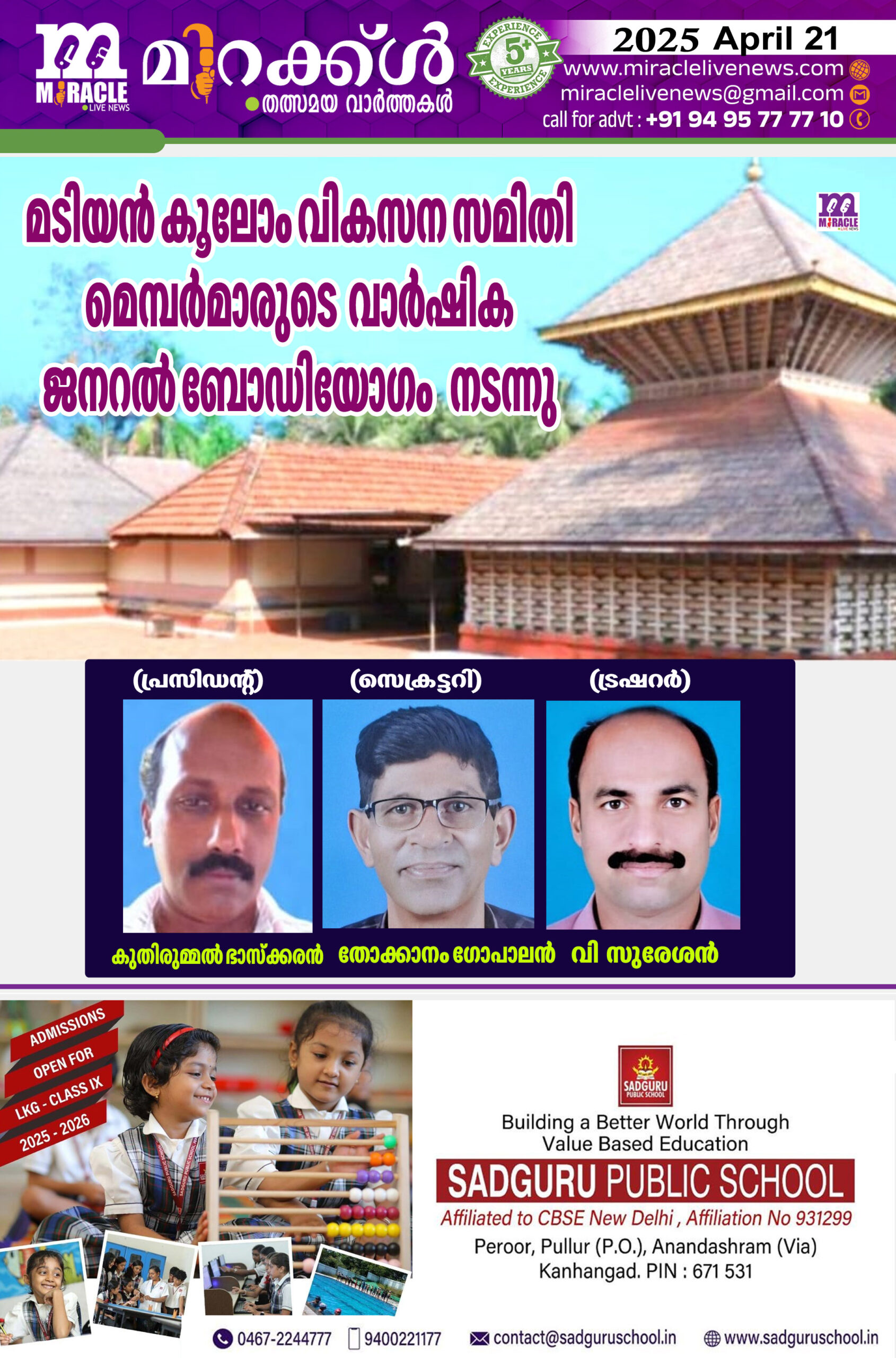 മടിയന് കൂലോം വികസന സമിതി മെമ്പര്മാരുടെ വാര്ഷിക ജനറല് ബോഡിയോഗം നടന്നു