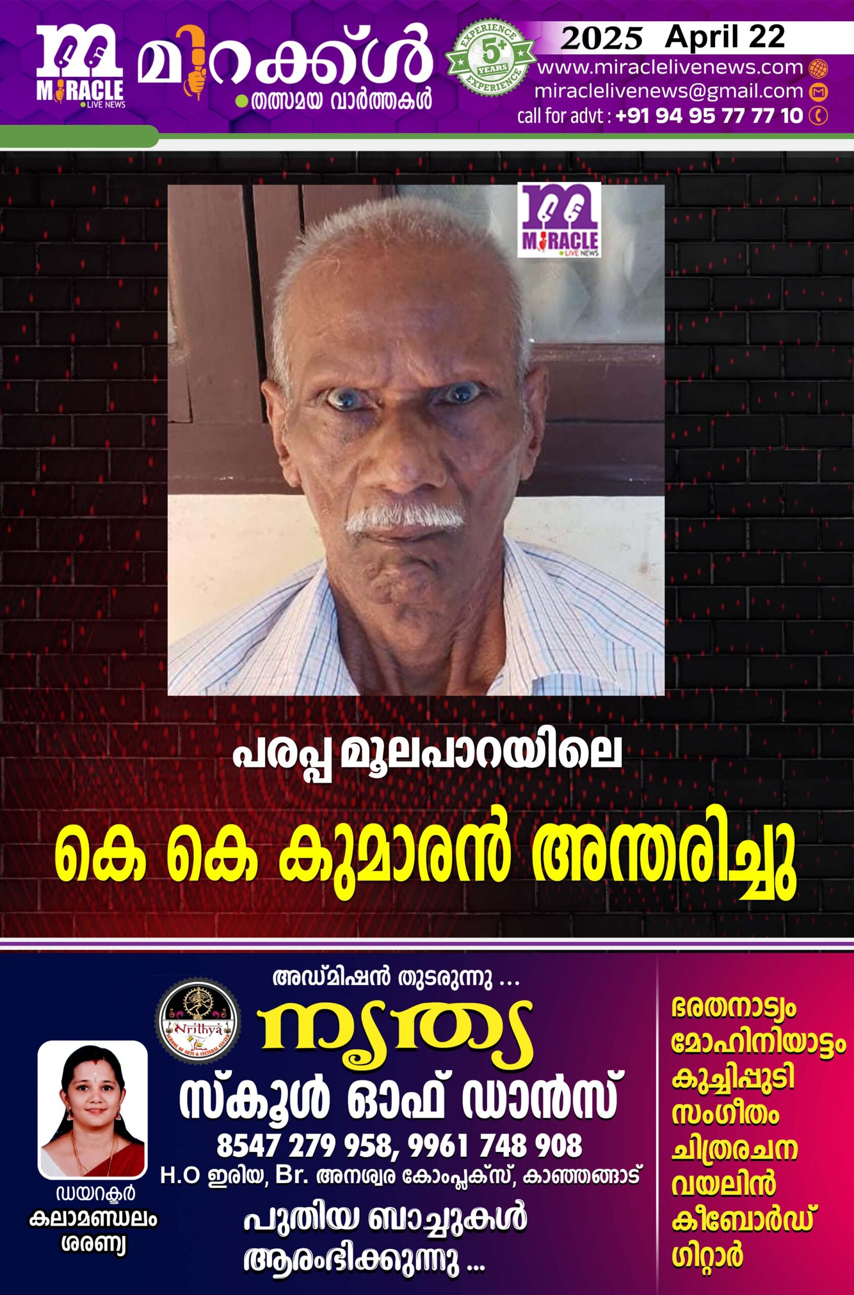 പരപ്പ :മൂലപാറയിലെ കെ കെ കുമാരന് (85) അന്തരിച്ചു. ഭാര്യ: മാണിക്കം. മക്കള്:രാഘവന് ( തായന്നൂര് സര്വീസ് സഹകരണ ബാങ്ക് പരപ്പാ ശാഖ സെക്യൂരിറ്റി), പത്മനാഭന്, മുകുന്ദന് ( ഓട്ടോ ഡ്രൈവര് പരപ്പ ) , ശാരദ ( അത്തിക്കോത്ത് ). മരുമക്കള്: ദേവകി,
