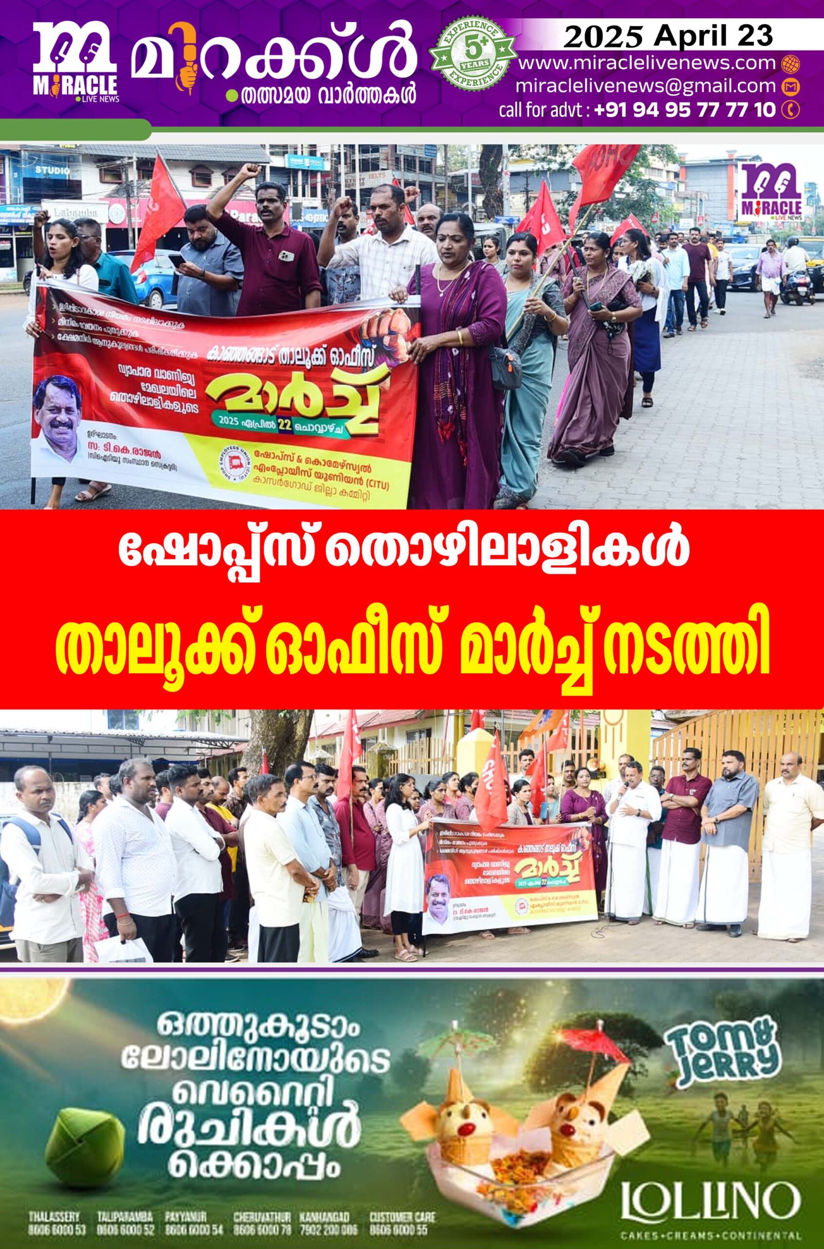 കാഞ്ഞങ്ങാട്: വ്യാപാര വാണിജ്യ മേഖലയിലെ തൊഴിലാളികളുടെ മിനിമം വേതനം പുതുക്കുക ക്ഷേമ നിധി അനുകൂല്യങ്ങള് പരിഷ്കരിക്കുക ഇരിപ്പിടവകാശം നിയമം നടപ്പിലാക്കുക തുടങ്ങി നിരവധി ആവശ്യങ്ങള് ഉന്നയിച്ചു ഷോപ്പ്സ് ആന്റ് കോമേഴ്സ്യല് എംപ്ലോയീസ് യൂണിയന് സി ഐ ടി യു കാസര്കോട് ജില്ലാ കമ്മിറ്റി ജില്ലയിലെ വ്യാപാര വാണിജ്യ സ്ഥാപനങ്ങളില് ജോലി ചെയ്യുന്ന തൊഴിലാളികള് കാഞ്ഞങ്ങാട് താലൂക്ക് ഓഫീസിലേക്ക് മാര്ച്ച് നടത്തി മാര്ച്ച് സിഐടിയു സംസ്ഥാന സെക്രട്ടറി ടി കെ രാജന് ഉദ്ഘാടനം ചെയ്തു.ജില്ലാ വൈസ് പ്രസിഡന്റ് എം രാഘവന് അധ്യക്ഷത വഹിച്ചു. യൂണിയന് ജില്ലാ സെക്രട്ടറി കെ രവീന്ദ്രന് സ്വാഗതം പറഞ്ഞു . നിതിന് തീര്ത്ഥങ്കര, മനോജ് പെരുമ്പള, പിഎം വിജയന്, തുടങ്ങിയവര്സംസാരിച്ചു.