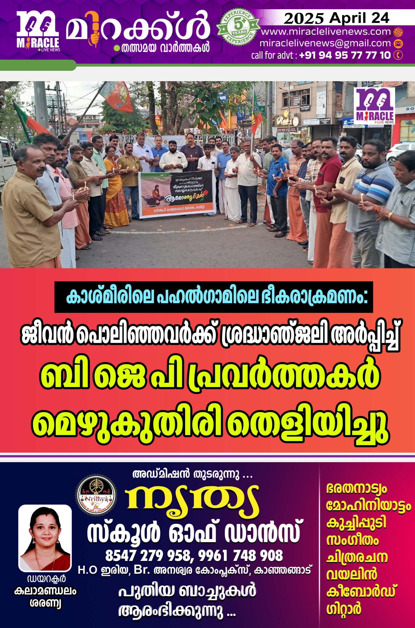 കാശ്മീരിലെ പഹല്ഗാമിലെ ഭീകരാക്രമണം: ജീവന് പൊലിഞ്ഞവര്ക്ക് ശ്രദ്ധാഞ്ജലി അര്പ്പിച്ച് ബി ജെ പി പ്രവര്ത്തകര് മെഴുകുതിരി തെളിയിച്ചു