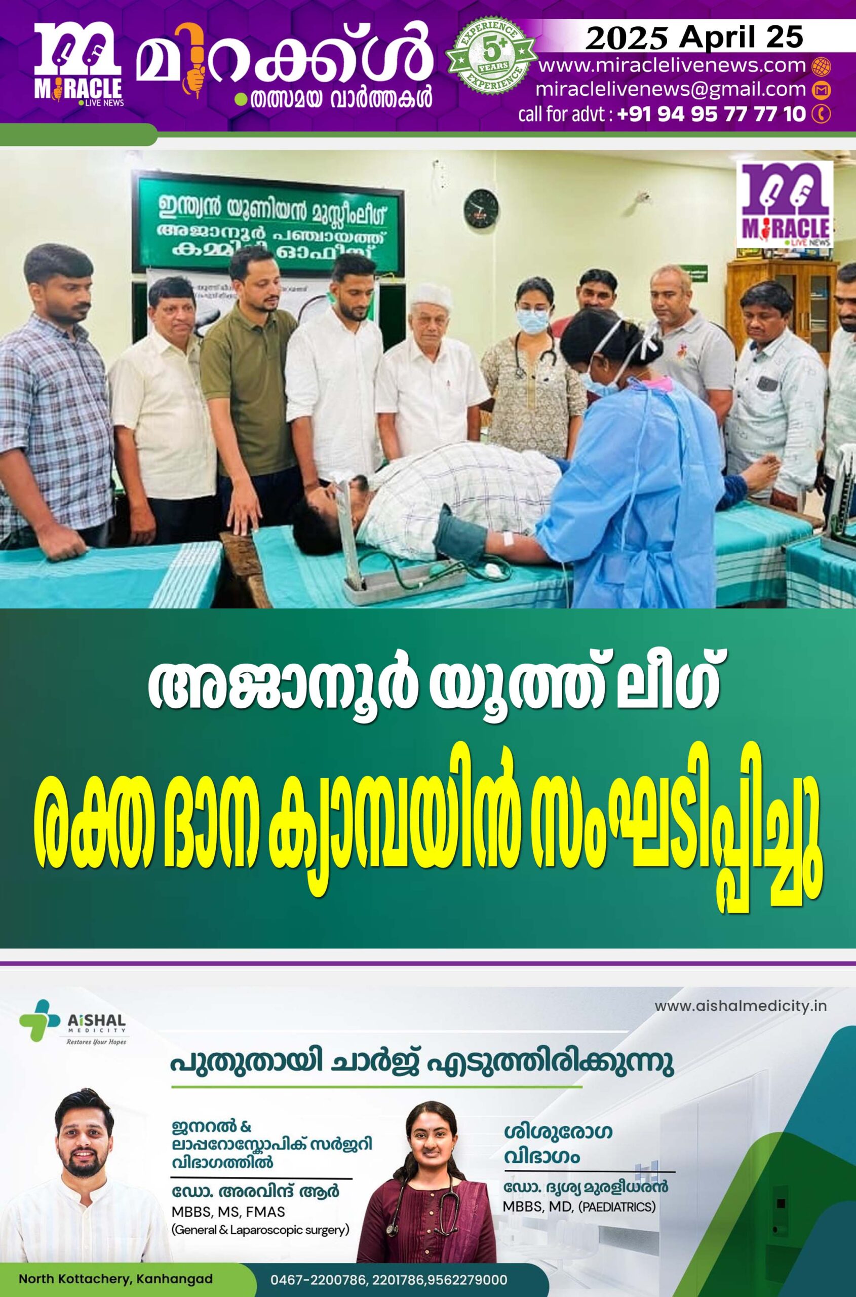 കാഞ്ഞങ്ങാട് : അജാനൂര് മുസ്ലിം യൂത്ത് ലീഗ് കമ്മിറ്റിയുടെ ആഭിമുഖ്യത്തില് കാഞ്ഞങ്ങാട് ജില്ലാ ആശുപത്രിയുടെ സഹകരണത്തോടെ രക്ത ദാന ക്യാമ്പയിന് സംഘടിപ്പിച്ചു. പഞ്ചായത്ത് മുസ്ലിം ലീഗ് ഓഫീസില് വെച്ച് നടന്ന ക്യാമ്പ് പഞ്ചായത്ത് മുസ്ലിം ലീഗ് പ്രസിഡന്റ് മുബാറക്ക് ഹസൈനാര് ഹാജി ഉദ്ഘാടനം ചെയ്തു. പ്രസിഡന്റ് ആസിഫ് ബദര് നഗര് അധ്യക്ഷത വഹിച്ചു ജനറല് സെക്രട്ടറി അഷ്കര് അതിഞ്ഞാല് സ്വാഗതം പറഞ്ഞു. ജില്ലാ ആശുപത്രി ബ്ലഡ് ബാങ്ക് ഡിപ്പാര്ട്മെന്റ് ഡയറക്ടര് ഡോ: അംജിത,കൗണ്സിലര് അരൂണ് ബേബി, ബ്ലഡ് ബാങ്ക് ജീവനക്കാര് ക്യാമ്പിന് നേതൃത്വം നല്കി. രക്ത ദാനം മഹാ ദാനമാണെന്നും അവയവദാനം പോലെ തന്നെ മഹത്തരമായ കാര്യമാണ് രക്തദാനമെന്നും ഉദ്ഘാടന വേളയില് മുബാറക്ക് ഹസൈനാര് പറഞ്ഞു രക്തദാനംകൊണ്ട് നമുക്ക് യാതൊരു വിധ ദോഷവുമില്ലെന്ന് മാത്രമല്ല ഗുണങ്ങളാണ് ഉണ്ടാകുന്നതെന്നും രക്തം ദാനം ചെയ്യാന് പലരും മടിക്കുകയോ ഭയപ്പെടുകയോ ചെയ്യുന്നതായിട്ടാണു കണ്ടു വരുന്നത്.