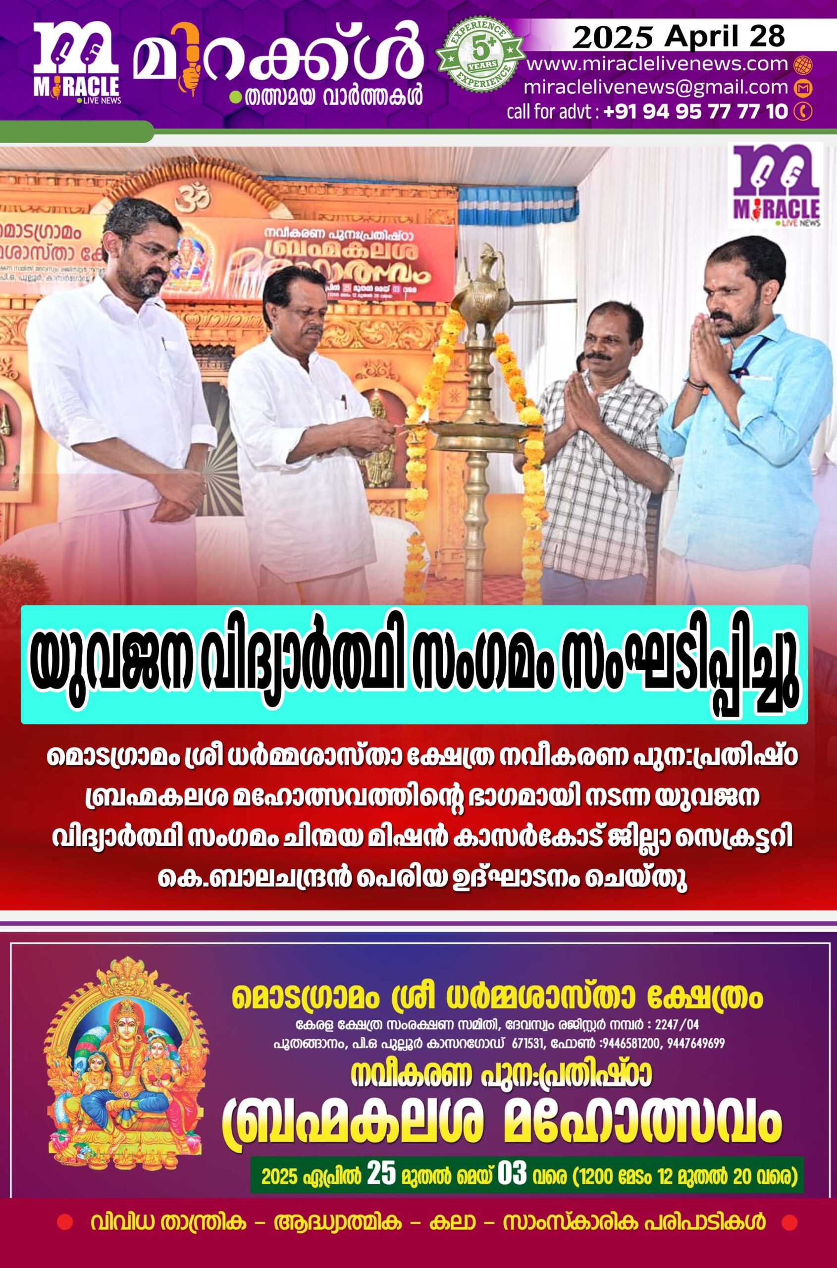 യുവജന വിദ്യാര്ത്ഥി സംഗമം സംഘടിപ്പിച്ചു; മൊടഗ്രാമം ശ്രീ ധര്മ്മശാസ്താ ക്ഷേത്ര നവീകരണ പുന:പ്രതിഷ്ഠ ബ്രഹ്മകലശ മഹോത്സവത്തിന്റെ ഭാഗമായി നടന്ന യുവജന വിദ്യാര്ത്ഥി സംഗമം ചിന്മയ മിഷന് കാസര്കോട് ജില്ലാ സെക്രട്ടറി കെ.ബാലചന്ദ്രന് പെരിയ ഉദ്ഘാടനം ചെയ്തു.