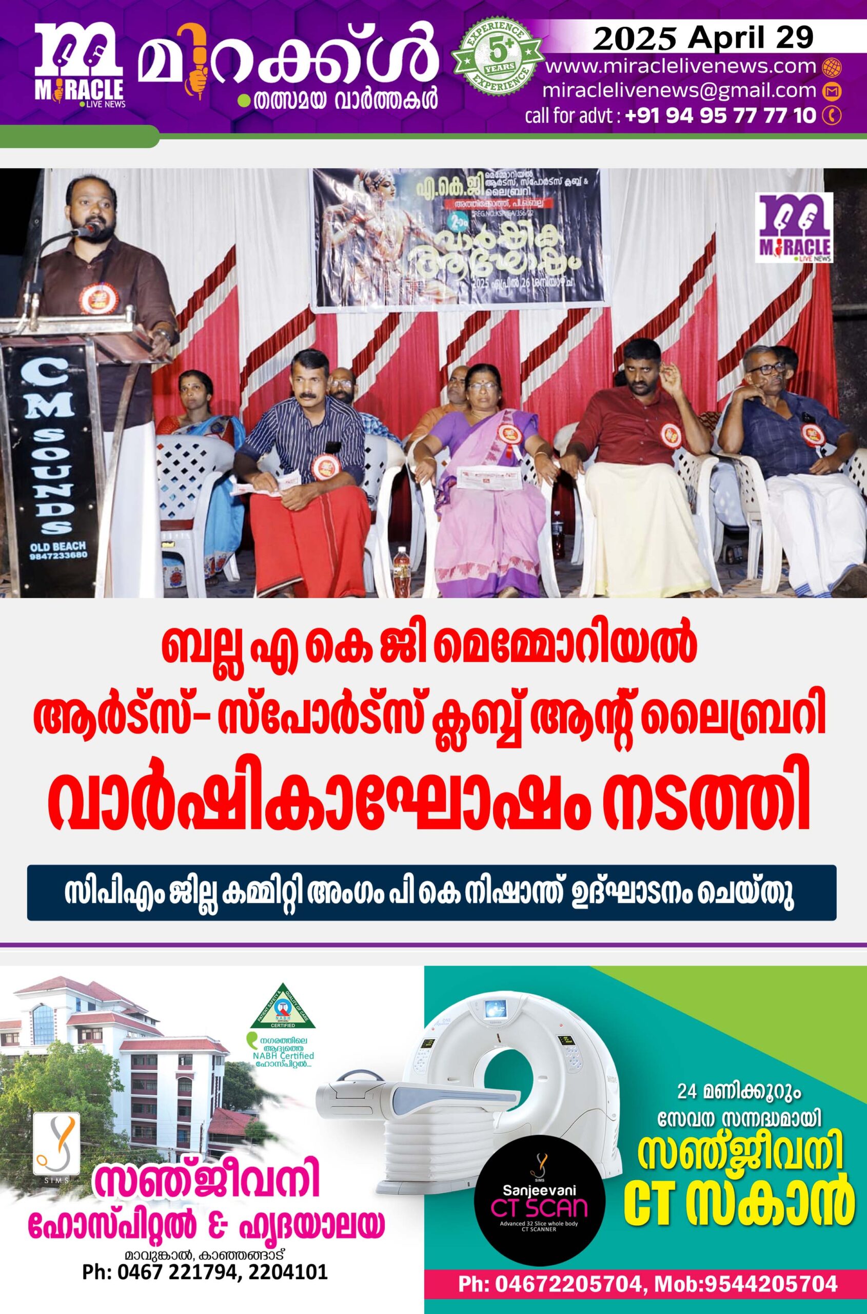 ബല്ല എ കെ ജി മെമ്മോറിയല് ആര്ട്സ്- സ്പോര്ട്സ് ക്ലബ്ബ് ആന്റ് ലൈബ്രറി വാര്ഷികാഘോഷം നടത്തി; സിപിഎം ജില്ല കമ്മിറ്റി അംഗം പി കെ നിഷാന്ത് ഉദ്ഘാടനം ചെയ്തു