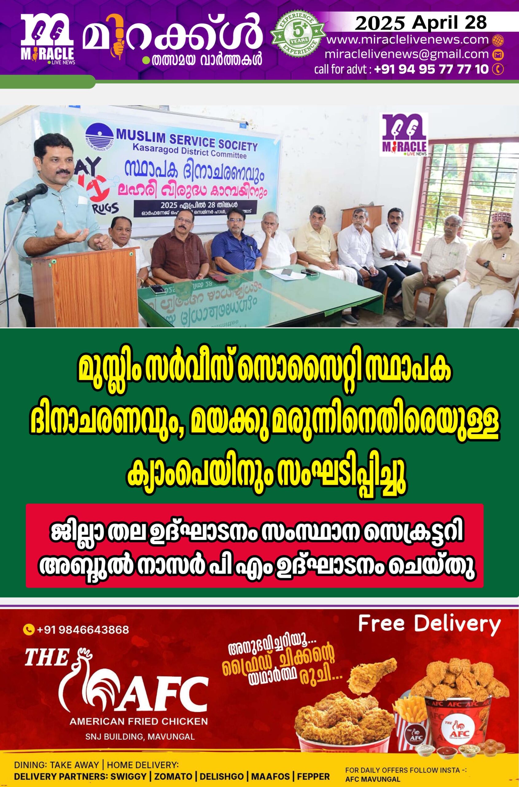 മുസ്ലിം സര്വീസ് സൊസൈറ്റി സ്ഥാപക ദിനാചരണവും, മയക്കു മരുന്നിനെതിരെയു ള്ള ക്യാംപെയിനും സംഘടിപ്പിച്ചു; ജില്ലാ തല ഉദ്ഘാടനം സംസ്ഥാന സെക്രട്ടറി അബ്ദുല് നാസര് പി എം ഉദ്ഘാടനം ചെയ്തു.