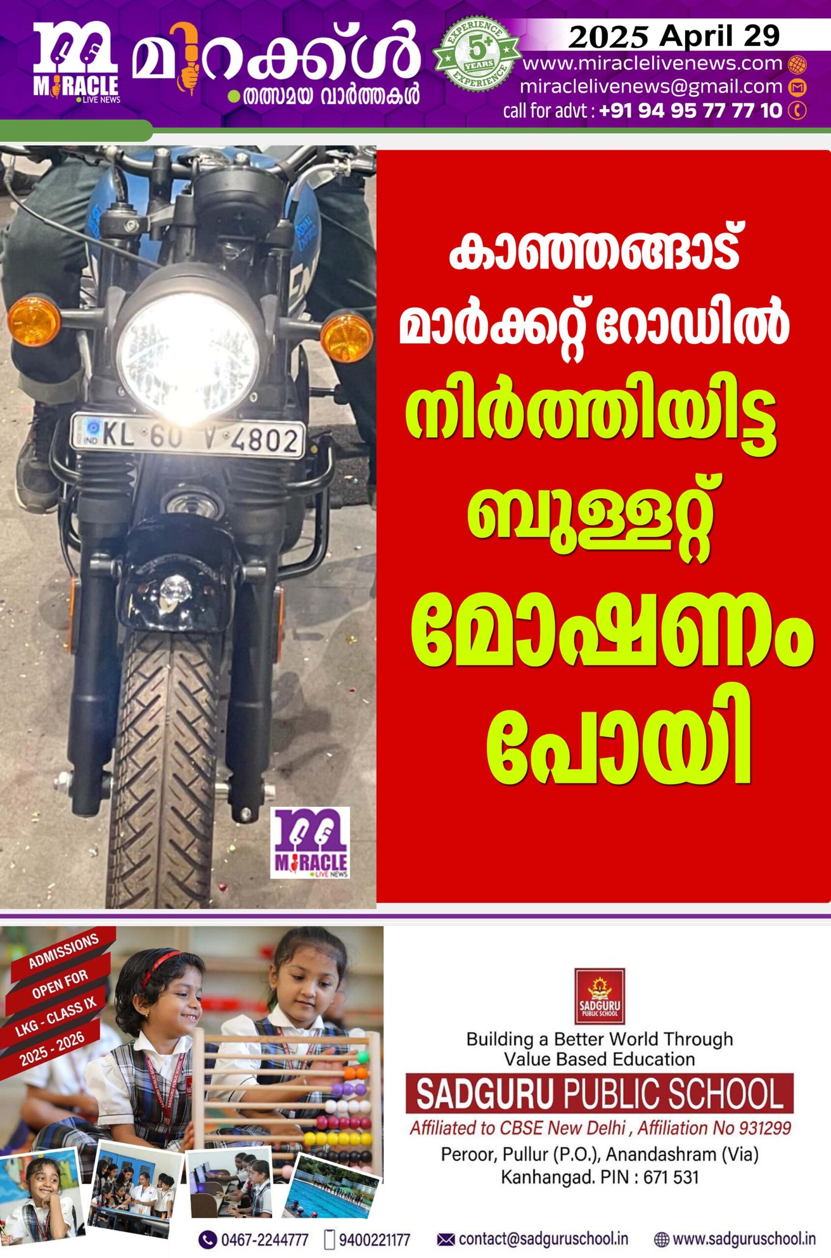 കാഞ്ഞങ്ങാട് : മല്സ്യ മാര്ക്കറ്റിന് സമീപം റോഡില് നിര്ത്തിയിട്ട ബുള്ളറ്റ് മോഷണം പോയി. നോര്ത്ത് കോട്ടച്ചേരി തുളുച്ചേരിയിലെ എം.നിധിന് കുമാറിന്റെ കെ എല് 60 വി 4802 നമ്പര് റോയല് എന്ഫീല്ഡ് ബുള്ളറ്റാണ് മോഷണം പോയത്. ഏപില് 25 ന് രാവിലെ 8 നും വൈകിട്ട് 5നും ഇടയിലുള്ള