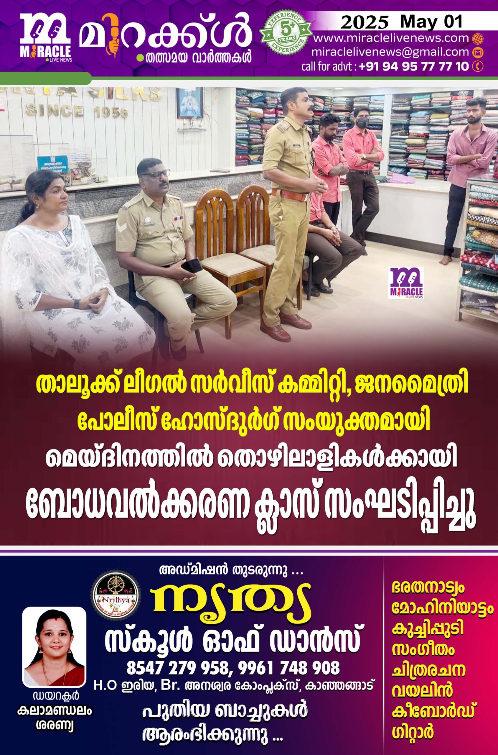 കാഞ്ഞങ്ങാട്: ലോക തൊഴിലാളി ദിനത്തില്‍ ലീഗല്‍ സര്‍വീസ് കമ്മിറ്റി ഹോസ്ദുര്‍ഗ് , ജനമൈത്രി പോലീസ് ഹോസ്ദുര്‍ഗ് സംയുക്ത ആഭിമുഖ്യത്തില്‍ സൂര്യ സില്‍ക്കിലെ തൊഴിലാളികള്‍ക്കായി നിയമാവബോധ ക്ലാസ് നടത്തി. ഹോസ്ദുര്‍ഗ് ഇന്‍സ്‌പെക്ടര്‍ പി അജിത് കുമാര്‍ ക്ലാസ്സ് ഉദ്ഘാടനം ചെയ്തു. ജനമൈത്രി ബീറ്റ് ഓഫീസര്‍ പ്രദീപന്‍ കോതൊളി അധ്യക്ഷത വഹിച്ചു. ഹോസ്ദുര്‍ഗ് ബാര്‍ അസോസിയേഷന്‍ അഡ്വ. വി ടി സതി ബോധവല്‍ക്കരണ ക്ലാസ് എടുത്തു. മാനേജര്‍ സജോ ജോസഫ് എന്നിവര്‍ സംസാരിച്ചു.പാരാ ലീഗല്‍ വളണ്ടിയര്‍ സി ബിന്ദു സ്വാഗതവും അസി.മാനേജര്‍ കെ എ ജിന്‍സണ്‍ നന്ദിയും പറഞ്ഞു. പരിപാടിയില്‍ 80 ഓളം തൊഴിലാളികള്‍പങ്കെടുത്തു