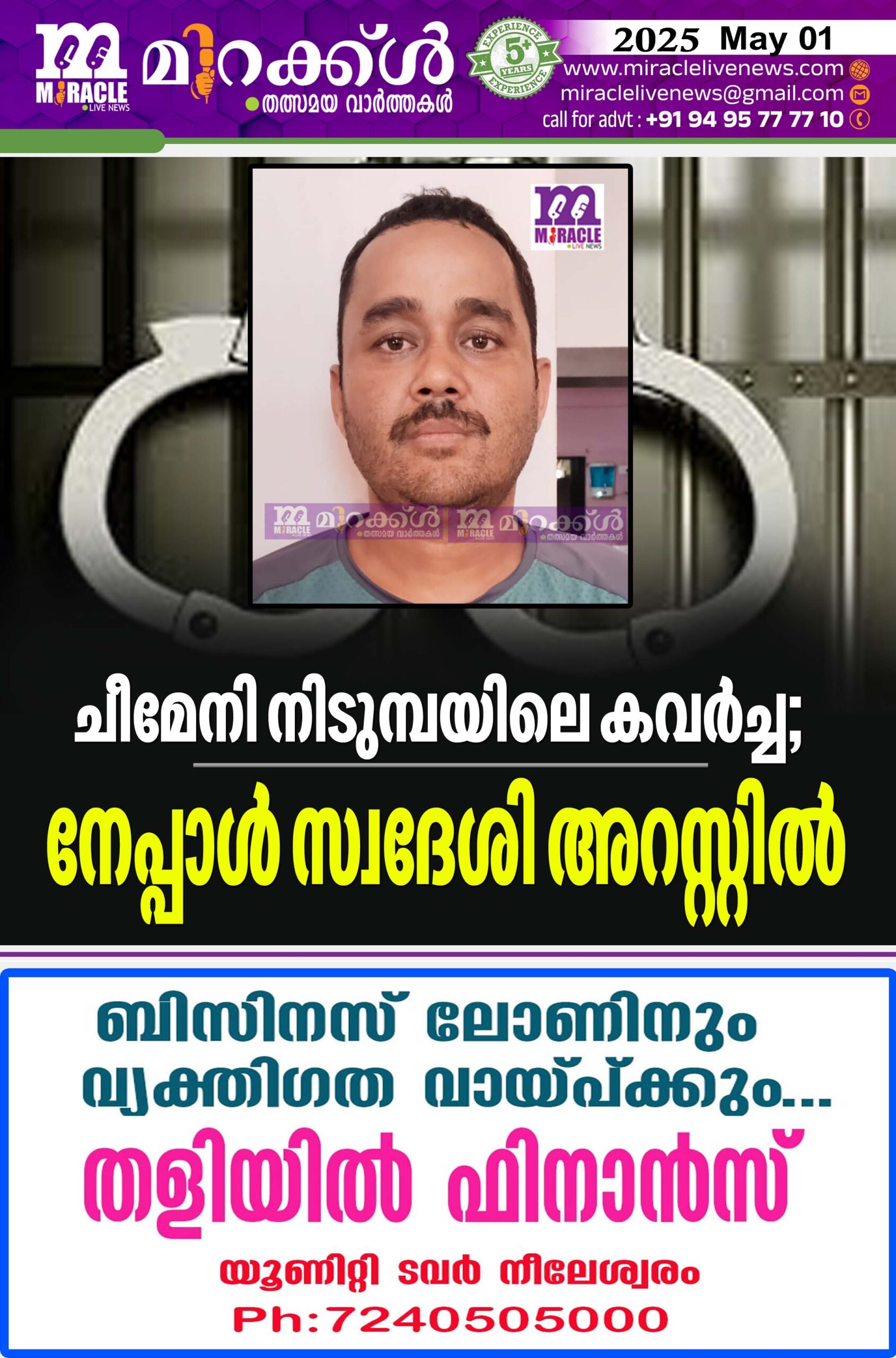 ചെറുവത്തൂര് : ചീമേനി നിടുമ്പയിലെ എന്. മുകേഷിന്റെ വീട് കുത്തിത്തുറന്ന് 40 പവനും നാലര കിലോ വെള്ളിപ്പാത്രങ്ങളും കവര്ന്ന കേസിലെ പ്രതകളില് ഒരാളെ പോലീസ് അറസ്റ്റ് ചെയ്തു. നേപ്പാള് സ്വദേശി നാര് ബഹദൂര് സാഹിയെയാണ് (30) പുണെ നിഗിഡി പോലീസിന്റെ സഹായത്തോടെ ചീമേനി ഇന്സ്പെക്ടര് കെ. അനില്കുമാര് അറസ്റ്റ് ചെയ്തത്. ബുധനാഴ്ച ഹോസ്ദുര്ഗ് ഒന്നാം ക്ലാസ് മജിസ്ട്രേറ്റ് കോടതി (ഒന്ന്) ഹാജരാക്കിയ ശേഷം തെളിവനെടുപ്പിനായി പോലീസ് കസ്റ്റഡിയില് വിട്ടുകൊടുത്തു.