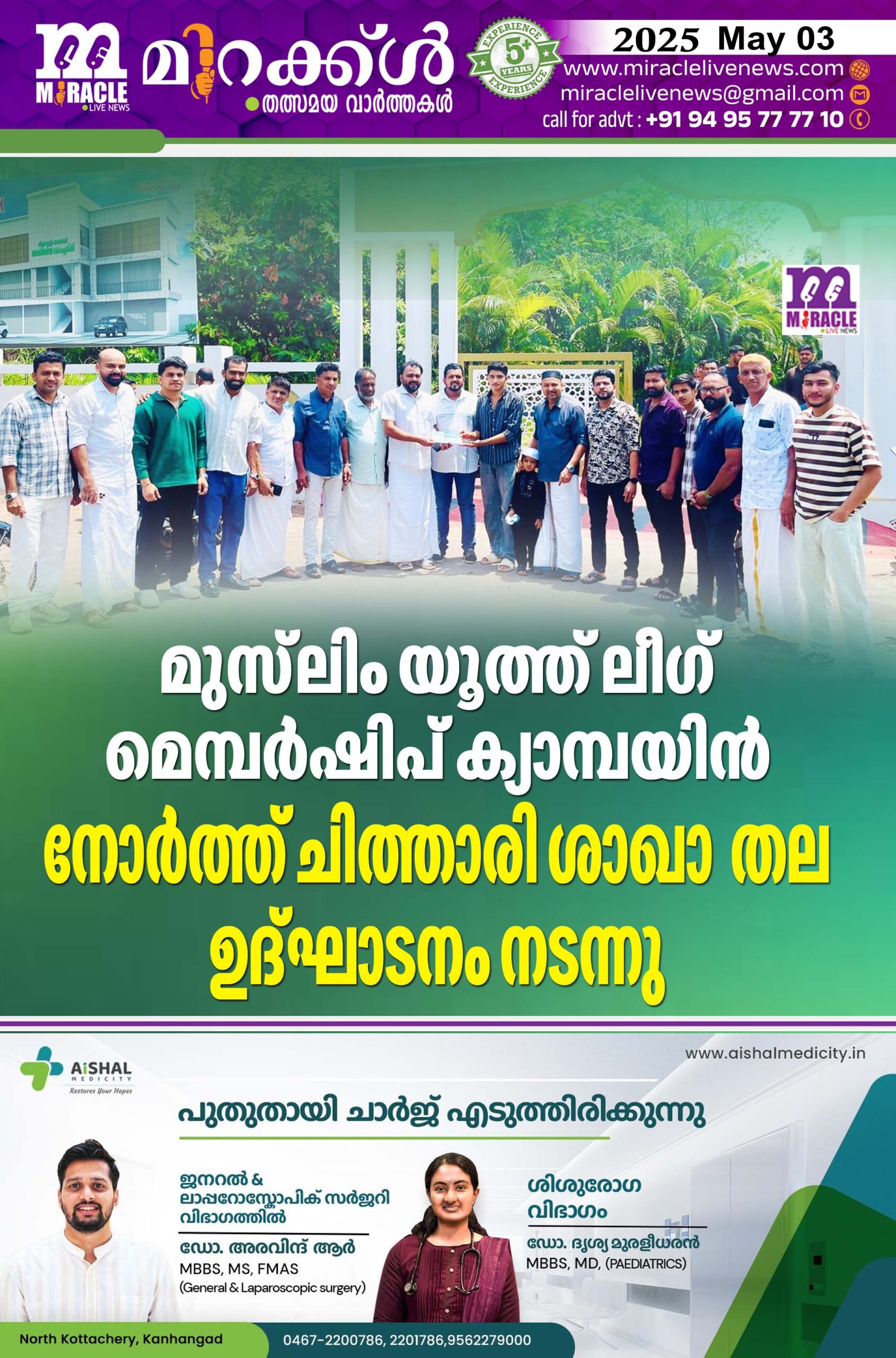 കാഞ്ഞങ്ങാട്: മുസ്ലിം യൂത്ത് ലീഗ് മെമ്പര്ഷിപ് ക്യാമ്പയിന് നോര്ത്ത് ചിത്താരി ശാഖാ തല ഉദ്ഘാടനം ചിത്താരി ഹസീന ആര്ട്സ് സ്പോര്ട്സ് ക്ലബ്ബ് പ്രസിഡന്റ് ഹസ്സന് യാഫാ ശാഖാ ജന:സെക്രട്ടറി ഷബീല് ചിത്താരിയെ ചേര്ത്ത് ഉദ്ഘാടനം ചെയ്തു. മുസ്ലിം ലീഗ് വാര്ഡ് ജന:സെക്രട്ടറി ഹമീദ്.പിവി,സെക്രട്ടറി ഷറഫുദ്ധീന്.സികെ, മണ്ഡലം യൂത്ത് ലീഗ് ട്രഷറര് ജബ്ബാര് ചിത്താരി, പഞ്ചായത്ത് വൈസ് പ്രസിഡന്റ് നിസാമുദ്ധീന്.സിഎച്ച്,സൈനുദ്ധീന്.ടിവി,ഫൈസല് ചിത്താരി, അബു ചിത്താരി, ഇസ്മായില്.ടിവി, റഷീദ് റത്തു, അസീസ്.സിഎച്ച്, നൗഷാദ് ബാരിക്കാട്, ഹനീഫ, ഹക്കീംബേങ്ങച്ചേരി, സിറാജ്.സിഎച്ച്, ശിഹാബ്.സിഎച്ച്, ജുനൈദ് പീടികയില് എന്നിവര്സംബന്ധിച്ചു.