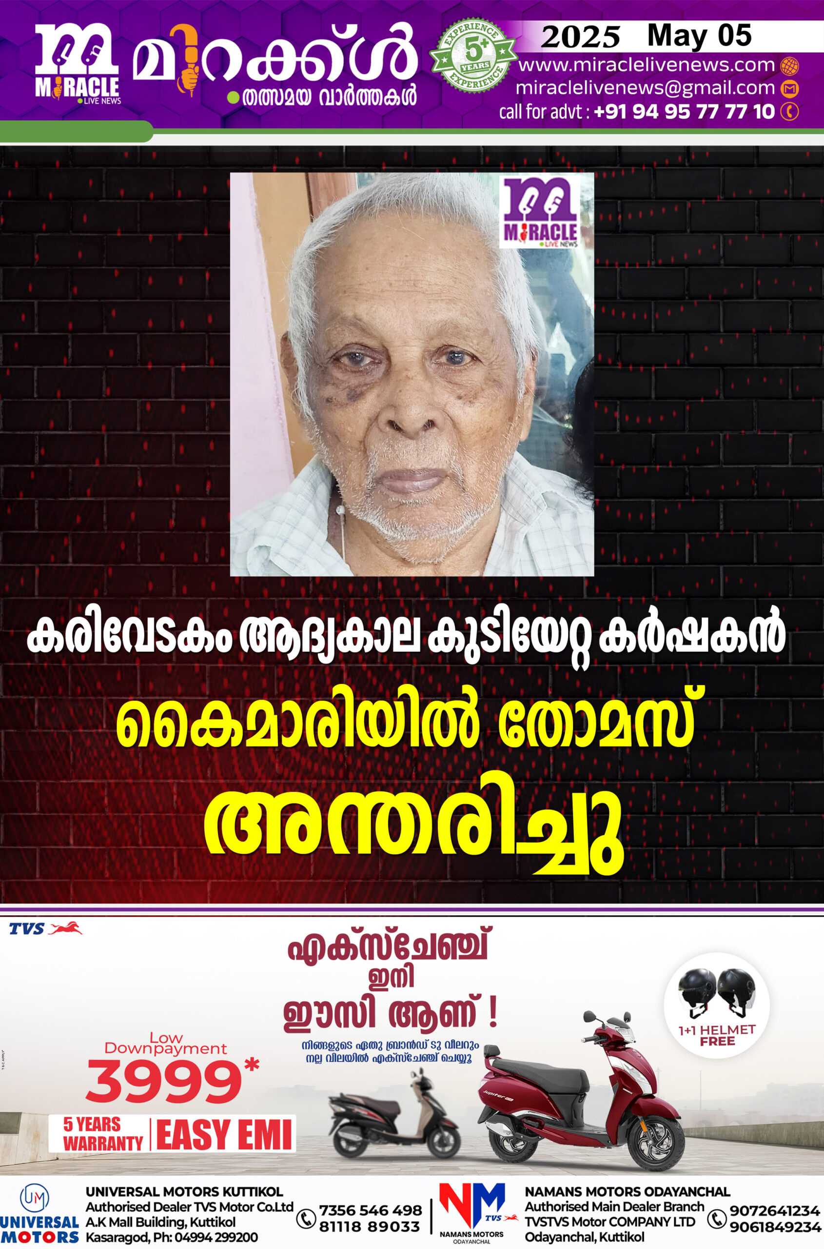 കുറ്റിക്കോല് :കരിവേടകം ആദ്യകാല കുടിയേറ്റ കര്ഷകന് കൈമാരിയില് തോമസ് (94) അന്തരിച്ചു. മൃതാസംസ്കാരം മെയ് 6 ന് ചൊവ്വാഴ്ച്ച രാവിലെ 10 മണിക്ക് വീട്ടില് നിന്നും അരഭിച്ച് കരിവേടകം സെന്റ് ജോസഫ് ദേവാലയം സെമിത്തേരിയില്. ഭാര്യ: മേരി വയനാട് വെള്ളമുണ്ട കാവുട്ടുകുഴി കുടുംബാംഗം മക്കള് : ലിസ്സി, ജെയിംസ്, സാലി, ബാബു, മനോജ്, ഷൈനി, ഷീജ, ഷൈജു. മരുമക്കള് :പരേതനായ ചാക്കോ ആനിമൂട്ടില്, ജയിനി, പരേതനായ ബാബു പേരന്തോട്ടി, ഷീന, ലീമ, ജോയ്,ബെന്നി,ബിന്സി.