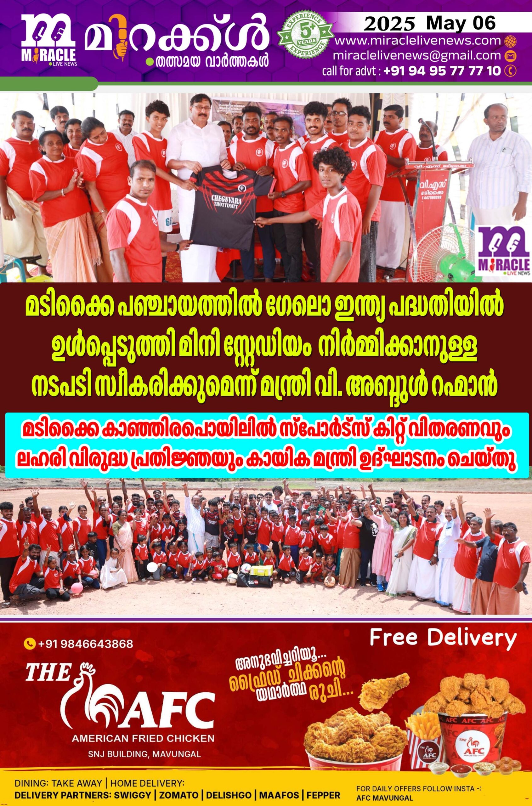 മടിക്കൈ പഞ്ചായത്തില്‍ ഗേലൊ ഇന്ത്യ പദ്ധതിയില്‍ ഉള്‍പ്പെടുത്തി മിനി സ്റ്റേഡിയം നിര്‍മ്മിക്കാനുള്ള നടപടി സ്വീകരിക്കുമെന്ന് മന്ത്രി വി. അബ്ദുള്‍ റഹ്‌മാന്‍; മടിക്കൈ കാഞ്ഞിരപൊയിലില്‍ സ്‌പോര്‍ട്‌സ് കിറ്റ് വിതരണവും ലഹരി വിരുദ്ധ പ്രതിജ്ഞയും കായിക മന്ത്രി ഉദ്ഘാടനം ചെയ്തു