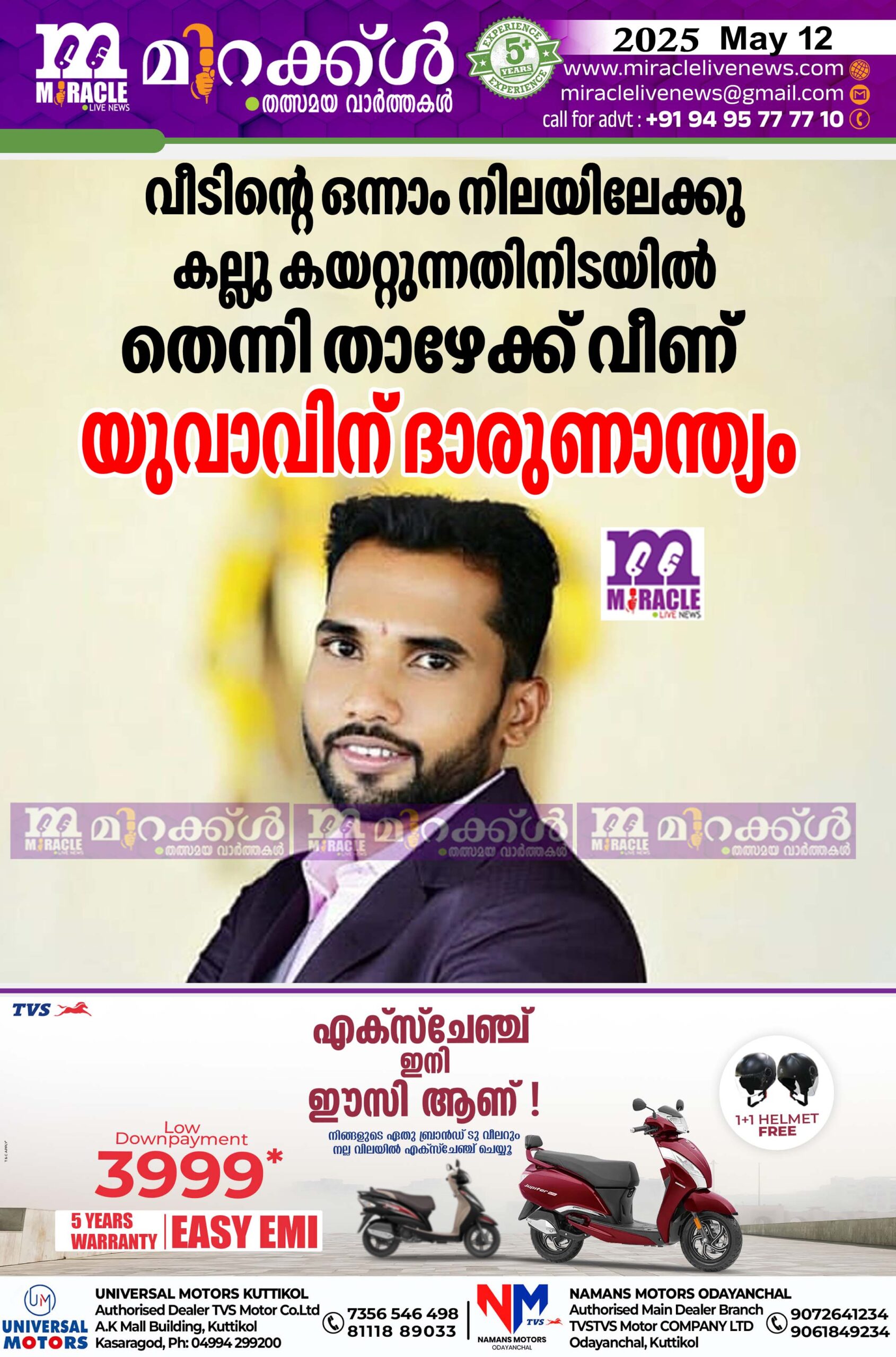 വീടിന്റെ ഒന്നാം നിലയിലേക്കു കല്ലു കയറ്റുന്നതിനിടയില് തെന്നി താഴേക്ക് വീണ് യുവാവിന് ദാരുണാന്ത്യം