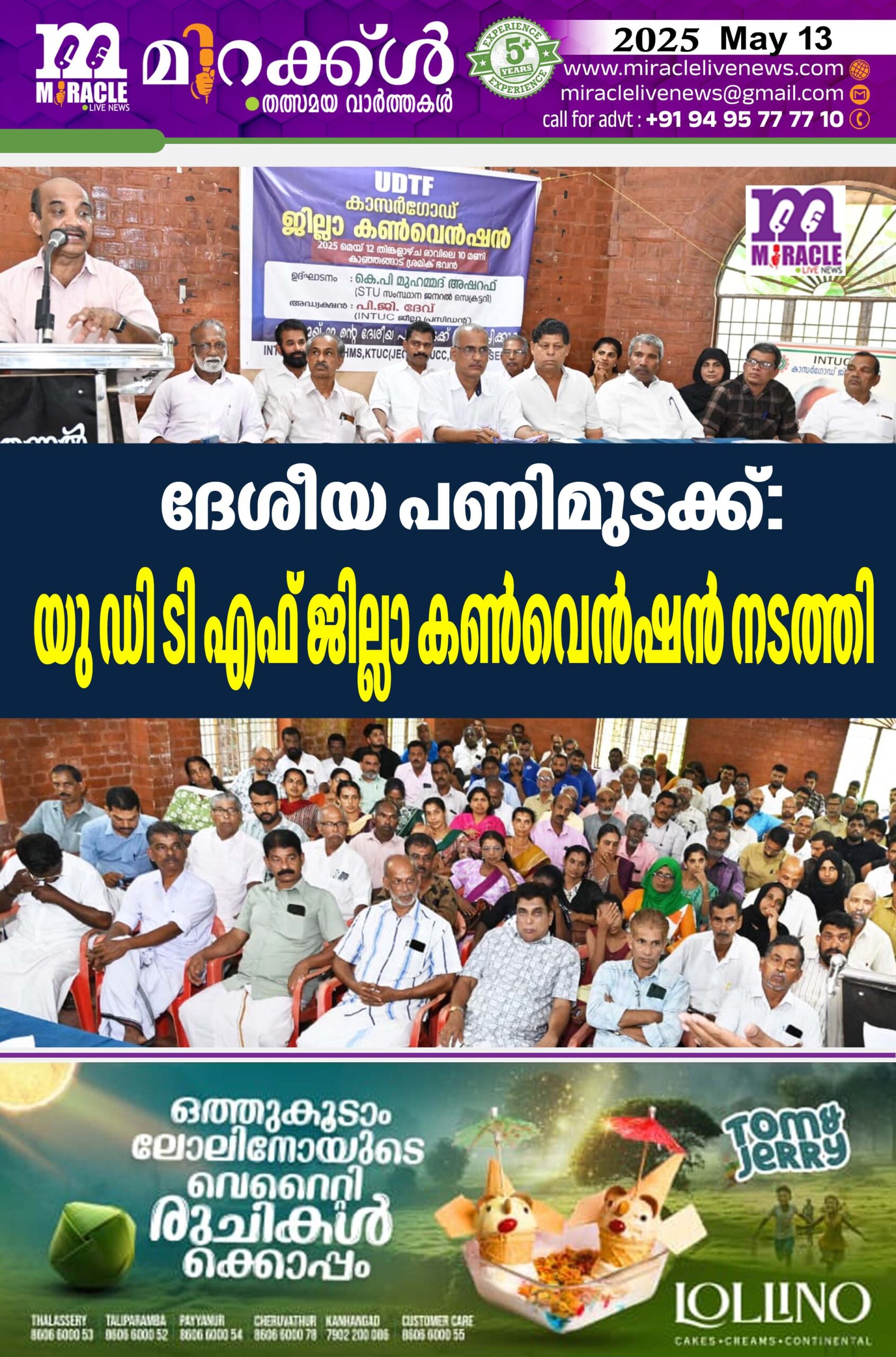 കാഞ്ഞങ്ങാട്: മെയ് 20ന് നടക്കുന്ന ദേശീയ പണി മുടക്കിന്റെ പ്രചരണാര്‍ത്ഥം ഐക്യ ജനാധിപത്യ ട്രേഡ് യൂണിയന്‍ (യു.ഡി.ടി.എഫ്) ജില്ലാ കണ്‍വെന്‍ഷന്‍ നടത്തി.എസ് ടി യു സംസ്ഥാന ജന.സെക്രട്ടറി കെ പി മുഹമ്മദ് അഷ്‌റഫ് ഉദ്ഘാടനം ചെയ്തു. ഐ എന്‍ ടി യു സി ജില്ല പ്രസിഡന്റ് പി ജി ദേവ് അധ്യക്ഷത വഹിച്ചു.എസ് ടി യു സംസ്ഥാന സെക്രട്ടറി ഷറീഫ് കൊടവഞ്ചി മേല്‍ കമ്മിറ്റി തീരുമാനങ്ങള്‍ വിശദീകരിച്ചു. ഐ എന്‍ ടി യു സി ജില്ലാ സെക്രട്ടറി കെ.എം. ശ്രീധരന്‍ സ്വാഗതം പറഞ്ഞു. പണിമുടക്കിന്റെ ഭാഗമായി പ്രചരണ പ്രവര്‍ത്തനങ്ങള്‍ ശക്തിപ്പെടുത്താനും പണിമുടക്ക് ദിവസം നിയോജക മണ്ഡലം കേന്ദ്രങ്ങളില്‍ പ്രതിഷേധ പ്രകടനവും സംഗമവും സംഘടിപ്പിക്കാനും തീരുമാനിച്ചു. ,ടിവി ഉമേഷന്‍,എ അഹമ്മദ് ഹാജി,മുത്തലിബ് പാറക്കെട്ട്,പി ഐ എ ലത്തീഫ്,ടി വി കുഞ്ഞിരാമന്‍,ബിഫാത്തിമ ഇബ്രാഹിം,തോമസ് സെബാസ്റ്റ്യന്‍,ആര്‍ വിജയകുമാര്‍,ലത സതീഷ്,എന്‍ ഗംഗാധരന്‍,എ കുഞ്ഞമ്പു പ്രസംഗിച്ചു. ഇന്ത്യാ-പാക് അതിര്‍ത്തിയില്‍ ഉണ്ടായ സംഘര്‍ഷത്തില്‍ കൊല്ലപ്പെട്ടവര്‍ക്ക് അനുശോചനം രേഖപ്പെടുത്തി.