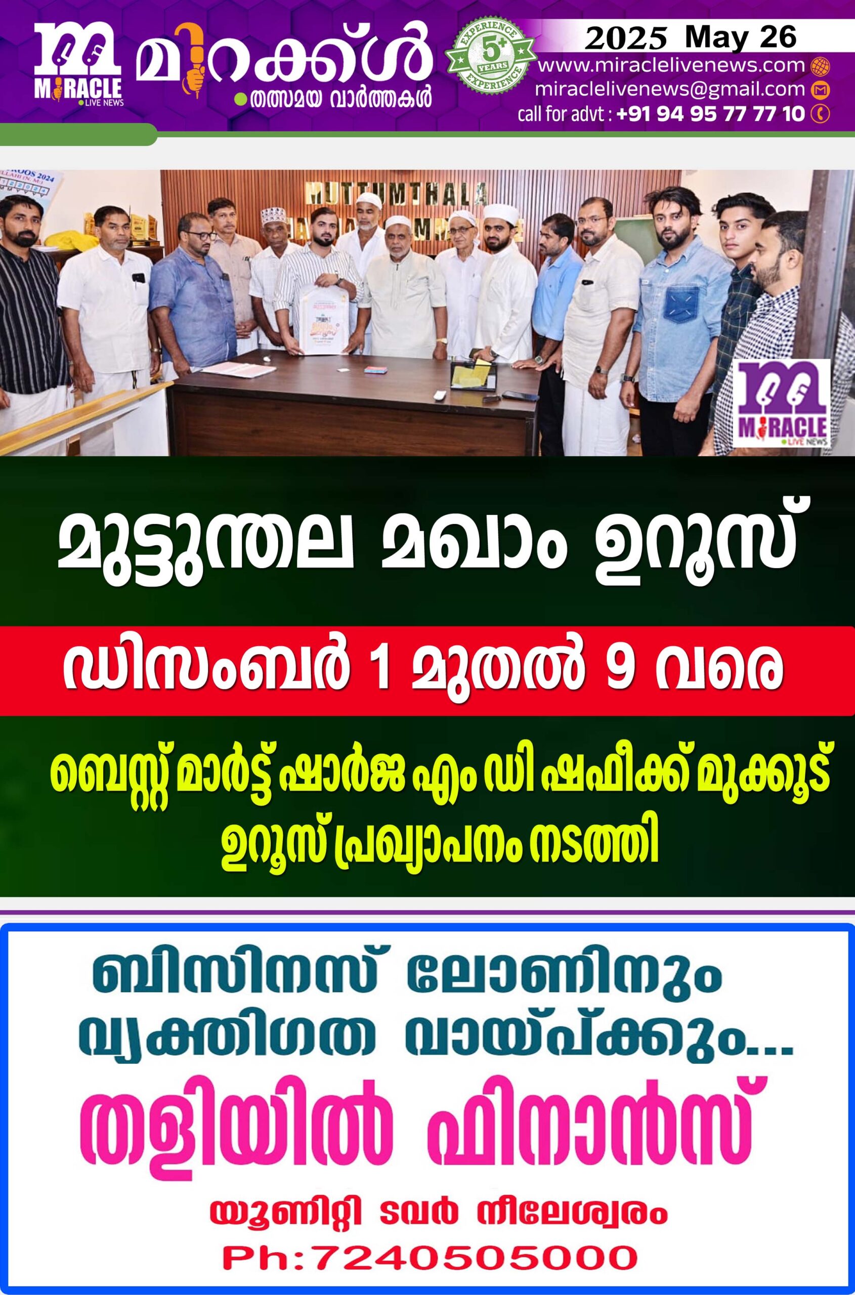 മുട്ടുന്തല മഖാം ഉറൂസ് ഡിസംബര് 1 മുതല് 9 വരെ; ബെസ്റ്റ് മാര്ട്ട് ഷാര്ജ എം ഡി ഷഫീക്ക് മുക്കൂട് ഉറൂസ് പ്രഖ്യാപനം നടത്തി