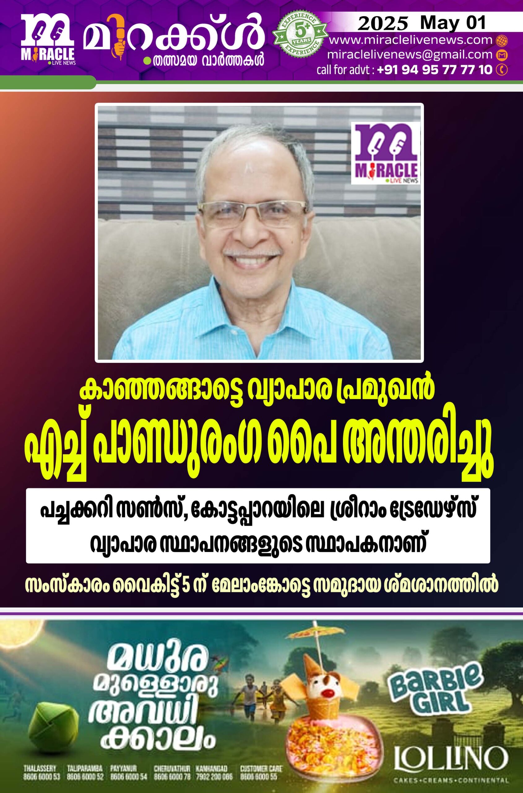 കാഞ്ഞങ്ങാട് : വ്യാപാര പ്രമുഖന് ദുര്ഗ ഹൈസ്കൂള് സമീപം താമസിക്കുന്ന എച്ച് പാണ്ഡുരംഗ പൈ ( 75)അന്തരിച്ചു .സംസ്കാരം ഇന്ന് വൈകിട്ട് അഞ്ചിന് മേലാംങ്കോട്ടെ സമുദായ സ്മശാനത്തില്. പുതിയകോട്ടയിലെ പച്ചക്കറി സണ്സ്, കോട്ടപ്പാറയിലെ ശ്രീറാം ട്രേഡേഴ്സ് വ്യാപാര സ്ഥാപനങ്ങളുടെ സ്ഥാപകനാണ്.പരേതരായ നരസിംഹ പൈ – രുക്മണി ദേവി എന്നിവരുടെ മകനാണ്. ഭാര്യ:പത്മ പൈ . മക്കള്: പ്രിയ ഷേണായി , പ്രശാന്ത് , പ്രവീണ് (ഇരുവരും ശ്രീറാം ട്രേഡേഴ്സ് കോട്ടപ്പാറ).മരുമക്കള്: ലക്ഷ്മണ് ഷേണായി (കോയമ്പത്തൂര്), നീതു (എടപ്പള്ളി) ഗൗരി (ചിക്കമാംഗ്ലൂര്). സഹോദരങ്ങള്: ത്രീവിക്രമ പൈ (പച്ചക്കറി സണ്സ് പുതിയകോട്ട), എച്ച് ഗുരുദത്ത് പൈ (പച്ചക്കറി സണ്സ് പുതിയ കേട്ട),പുഷ്പ ഷേണായി (പയ്യന്നൂര്), സുശീലാ കാമത്ത് (മുല്ക്കി), പരേതരായ സക്കു ഭായി കാമത്ത്, മീനാക്ഷികാമത്ത്.