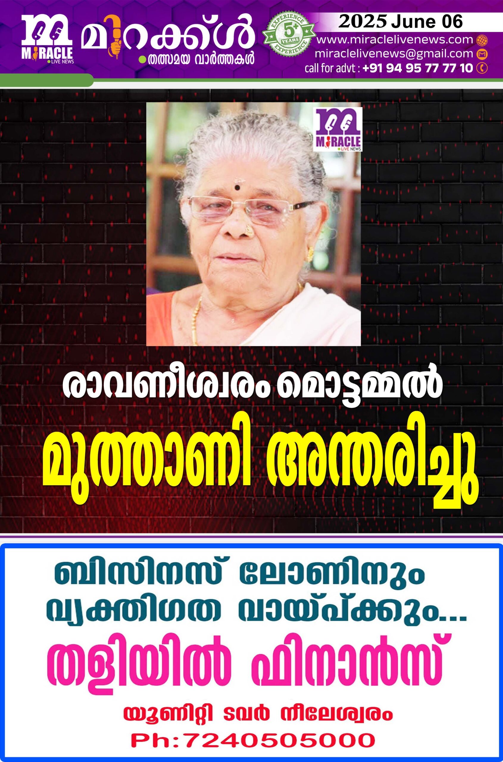 രാവണീശ്വരം: മൊട്ടമ്മല് മുത്താണി (90) അന്തരിച്ചു. ഭര്ത്താവ് പരേതനായ പൊക്കിളി.മക്കള്: നളിനി, ബാലന്, ശ്രീധരന്, നിര്മല, പവിത്രന്, അനിത. മരുമക്കള്: ദേവകി, ശാന്ത, ബാലന്, പദ്മ, കൃഷ്ണന്,പരേതനായ കണ്ണന്.