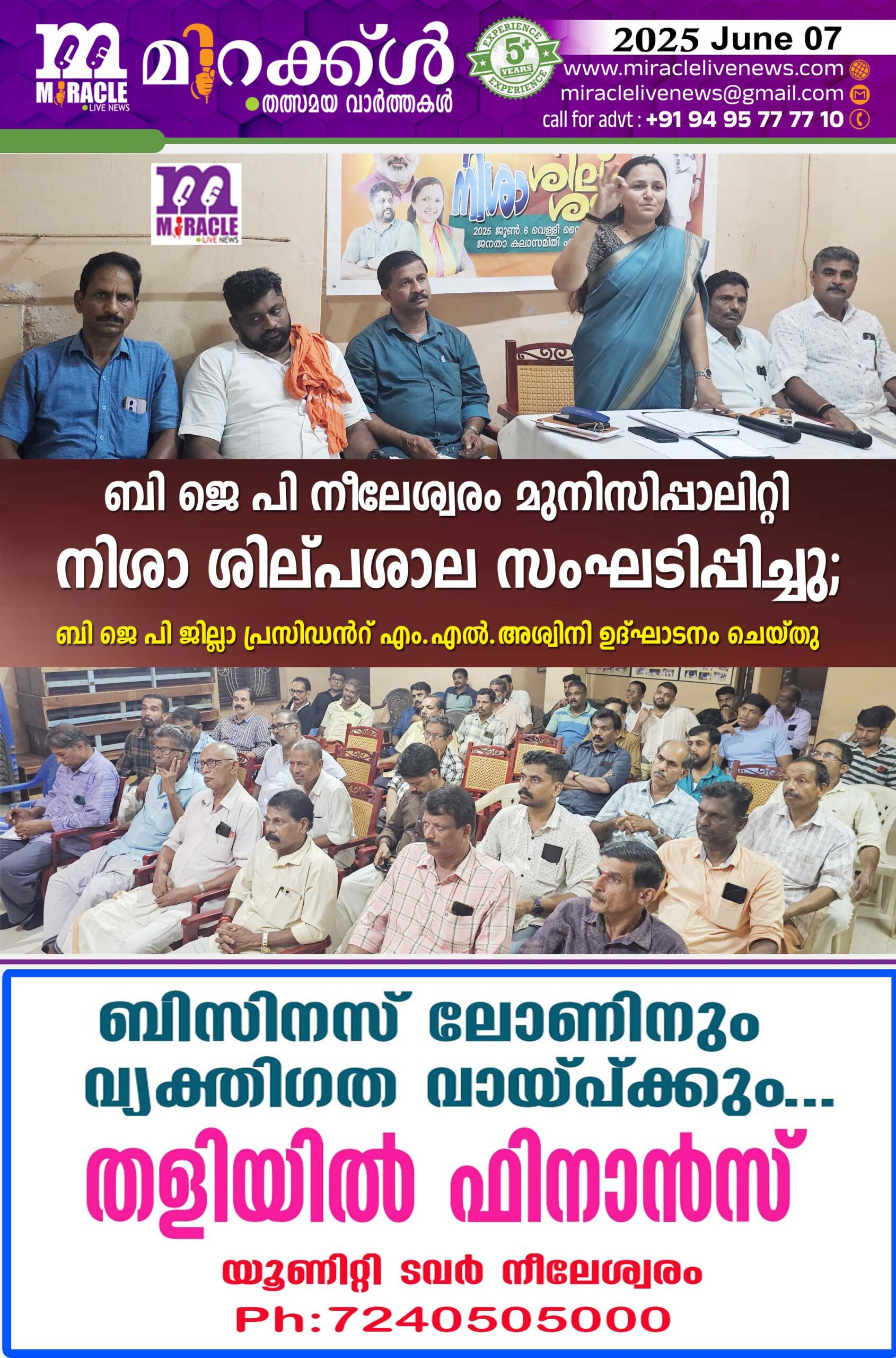 നീലേശ്വരം : വികസിത് കേരളം, എന്ന ലക്ഷ്യം സാക്ഷാല്‍ക്കരിക്കുന്നതിന് വേണ്ടി വരുന്ന നവംബര്‍ മാസം നടക്കാന്‍ പോകുന്ന തദ്ദേശസ്വയംഭരണ സ്ഥാപനങ്ങളിലേക്ക് നടക്കുന്ന തിരഞ്ഞെടുപ്പിന് മുന്നോടിയായി വികസിത വാര്‍ഡ് ടീം അംഗങ്ങളെ ഉള്‍പ്പെടുത്തിക്കൊണ്ട് ബി ജെ പി നീലേശ്വരം മുനിസിപ്പാലിറ്റി നിശാ ശില്പശാല നടത്തി. ബി ജെ പി ജില്ലാ പ്രസിഡന്റ് എം.എല്‍. അശ്വിനി ഉദ്ഘാടനം ചെയ്തു. കേന്ദ്രസര്‍ക്കാര്‍ നടപ്പിലാക്കുന്ന വികസന പദ്ധതികള്‍ നടപ്പിലാക്കാത്ത പിണറായി സര്‍ക്കാറിനെ താഴെയിറക്കാന്‍ കേരളത്തില്‍ ജയിക്കാനും ഭരിക്കാനും ബി.ജെ.പിക്ക് സാധിക്കണമെന്ന് അവര്‍ പ്രവര്‍ത്തകരോട് ആഹ്വാനം ചെയ്തു. ബി ജെ പി നീലേശ്വരം മുനിസിപ്പാലിറ്റി പ്രസിഡന്റ് പി.യു .വിജയകുമാര്‍ അദ്ധ്യക്ഷതവഹിച്ചു. ജില്ലാ ജനറല്‍ സെക്രട്ടറി എന്‍ കെ ബാബുരാജ് പരവനടുക്കം ക്ലാസ്സുകള്‍ അവതരിപ്പിച്ചു. മണ്ഡലം പ്രസിഡന്റ് സാഗര്‍ ചാത്തമത്ത്, ജനറല്‍സെക്രട്ടറിമാരായ, രാജീവന്‍ ചീമേനി, എ.കെ ചന്ദ്രന്‍ എന്നിവര്‍ സംസാരിച്ചു. മുനിസിപ്പാലിറ്റി ജനറല്‍ സെക്രട്ടറി ടി. രാധാകൃഷ്ണന്‍ സ്വാഗതവും, മണ്ഡലം സെക്രട്ടറി പി.മോഹനന്‍ നന്ദിയുംപറഞ്ഞു.