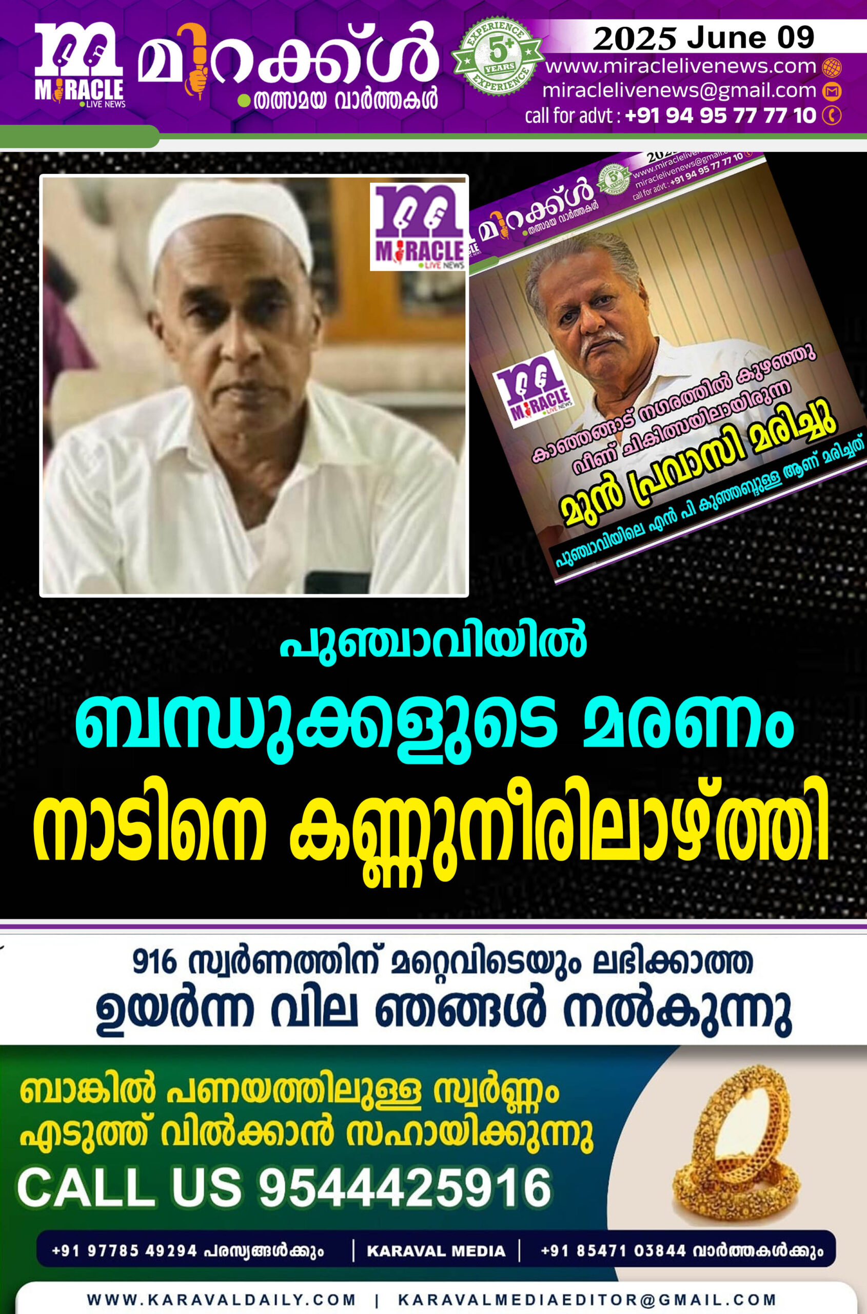 കാഞ്ഞങ്ങാട് : ബന്ധുകളുടെ മരണം നാടിനെ കണ്ണുനീരിലാഴ്ത്തി. മുന് പ്രവാസിയും കാരുണ്യ പ്രവര്ത്തനുമായ പുഞ്ചാവിയിലെ എന് പി .കുഞ്ഞബ്ദുള്ള (65) ശനിയാഴ്ച രാവിലെ ഹൃദയാഘാതത്തെ തുടര്ന്ന് മരണപ്പെട്ടിരുന്നു. ഇതിന് പിന്നാലെ കുഞ്ഞബ്ദുള്ളയുടെ ഉറ്റ സുഹൃത്തും അയല്വാസിയും