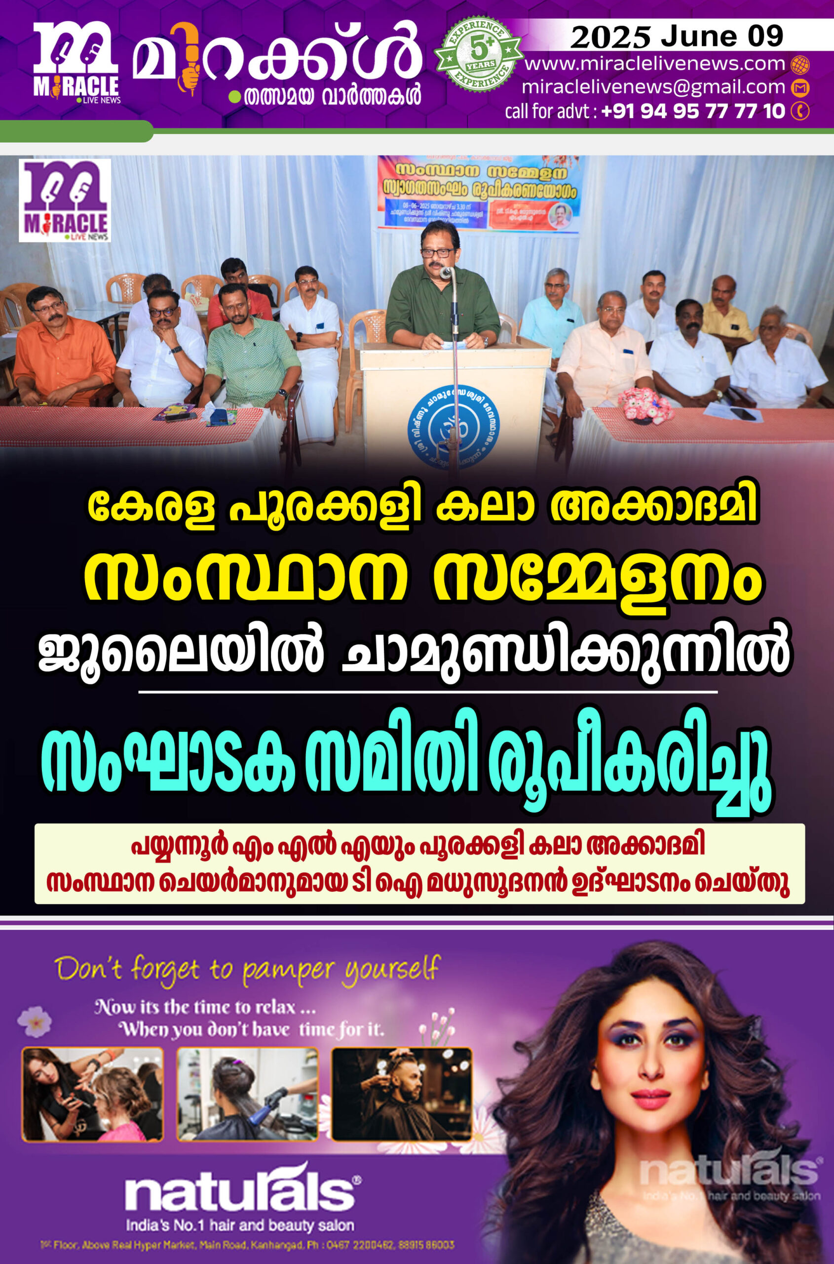 കാഞ്ഞങ്ങാട് :കേരള പൂരക്കളി കലാ അക്കാദമിയുടെ ഒമ്പതാമത് സംസ്ഥാന സമ്മേളനം ജൂലൈ മാസത്തില് ചാമുണ്ഡിക്കുന്ന് ശ്രീ വിഷ്ണുചാമുണ്ഡി ക്ഷേത്രത്തില് വെച്ച് നടത്തും. സമ്മേളന വിജയത്തിനായി സംഘാടക സമിതി രൂപീകരിച്ചു. പയ്യന്നൂര് എം എല് എ യും പൂരക്കളി കലാ അക്കാദമി സംസ്ഥാന ചെയര്മാനുമായ ടി ഐ മധുസൂദനന് ഉദ്ഘാടനം ചെയ്തു. അജാനൂര് പഞ്ചായത്ത് വൈസ് പ്രസിഡന്റ് കെ സബീഷ് അധ്യക്ഷനായി.