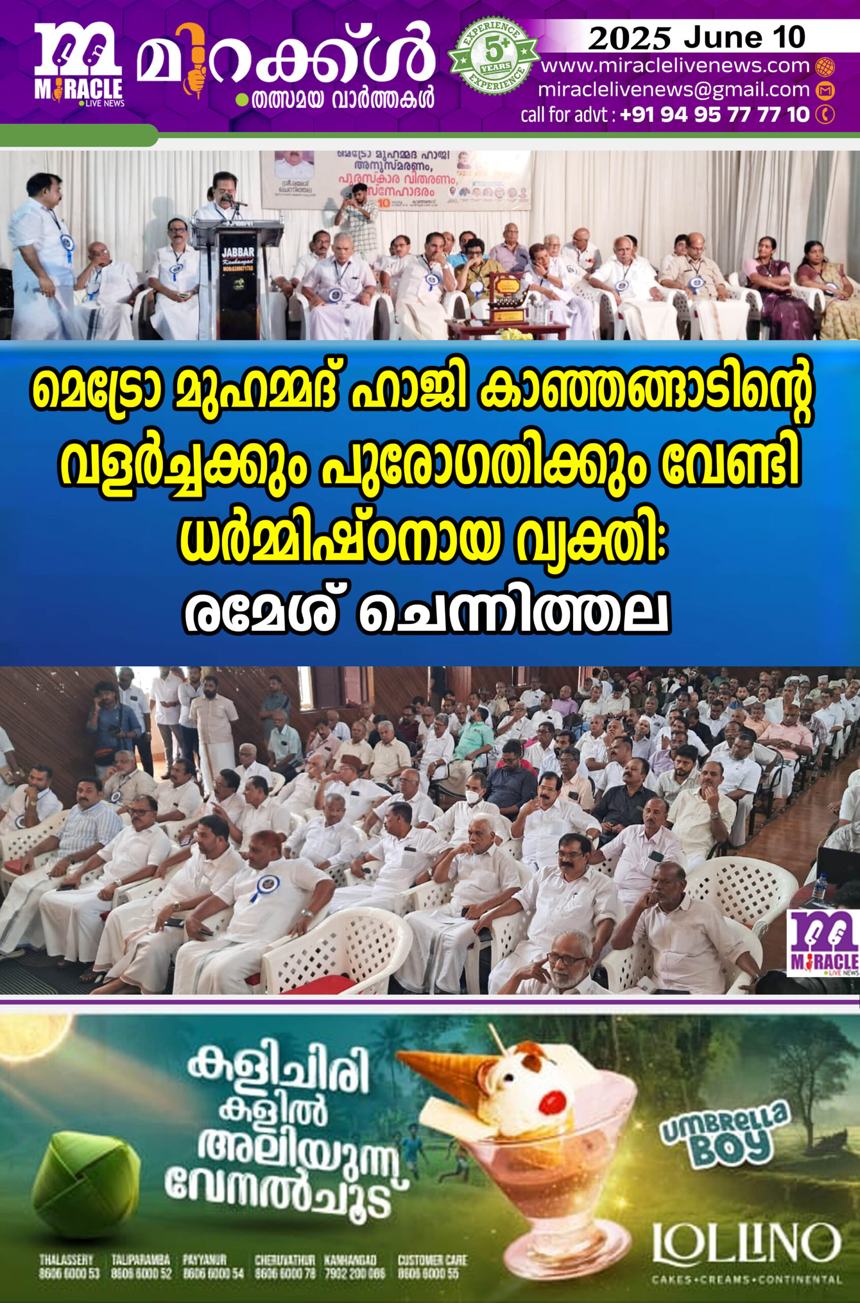 മെട്രോ മുഹമ്മദ് ഹാജി കാഞ്ഞങ്ങാടിന്റെ വളര്ച്ചക്കും പുരോഗതിക്കും വേണ്ടി ധര്മ്മിഷ്ഠനായ വ്യക്തി: രമേശ് ചെന്നിത്തല