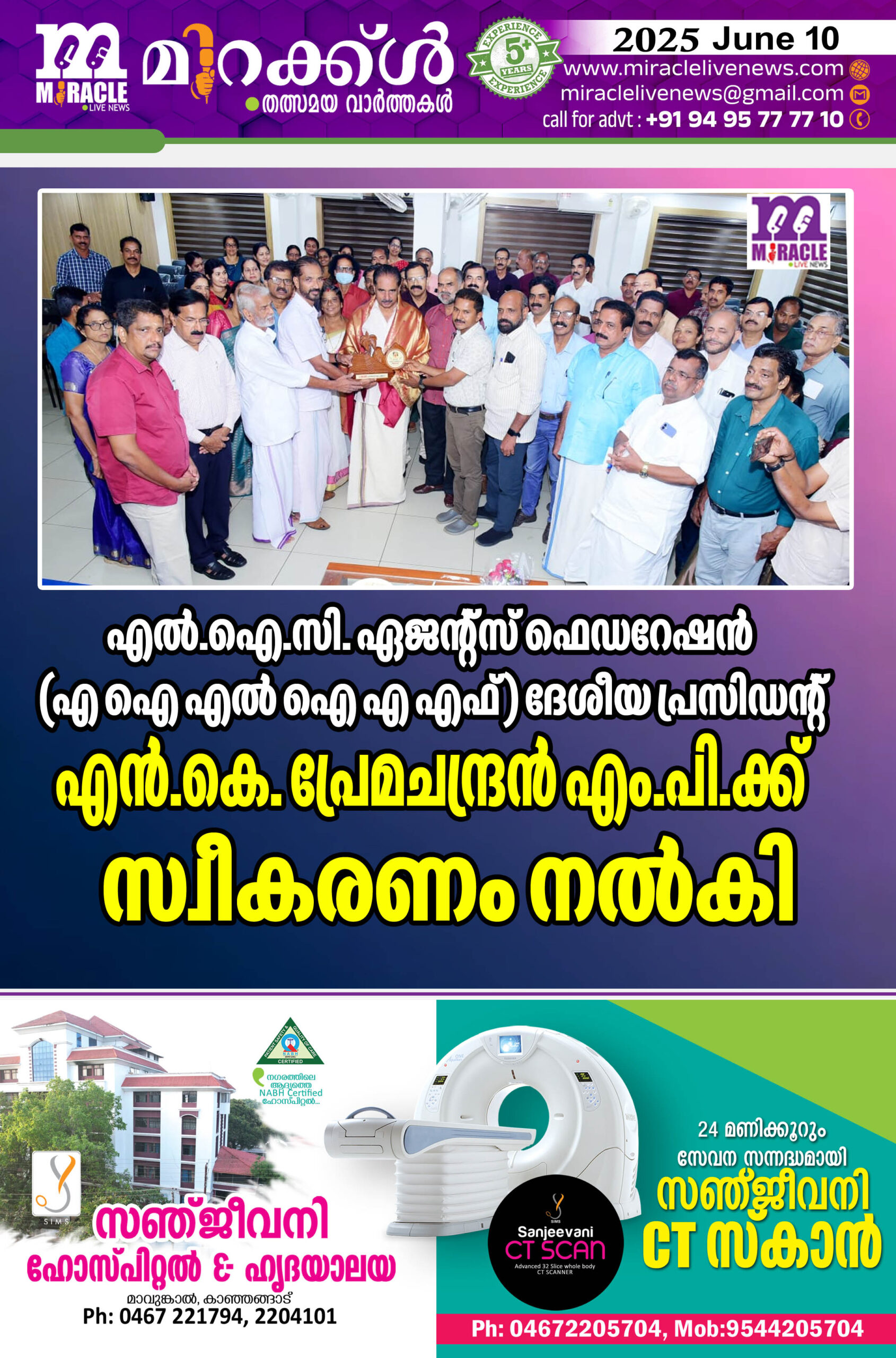 എല്‍.ഐ.സി. ഏജന്റ്‌സ് ഫെഡറേഷന്‍ (എ ഐ എല്‍ ഐ എ എഫ് ) ദേശീയ പ്രസിഡന്റ് എന്‍.കെ. പ്രേമചന്ദ്രന്‍ എം.പി.ക്ക് സ്വീകരണം നല്‍കി.