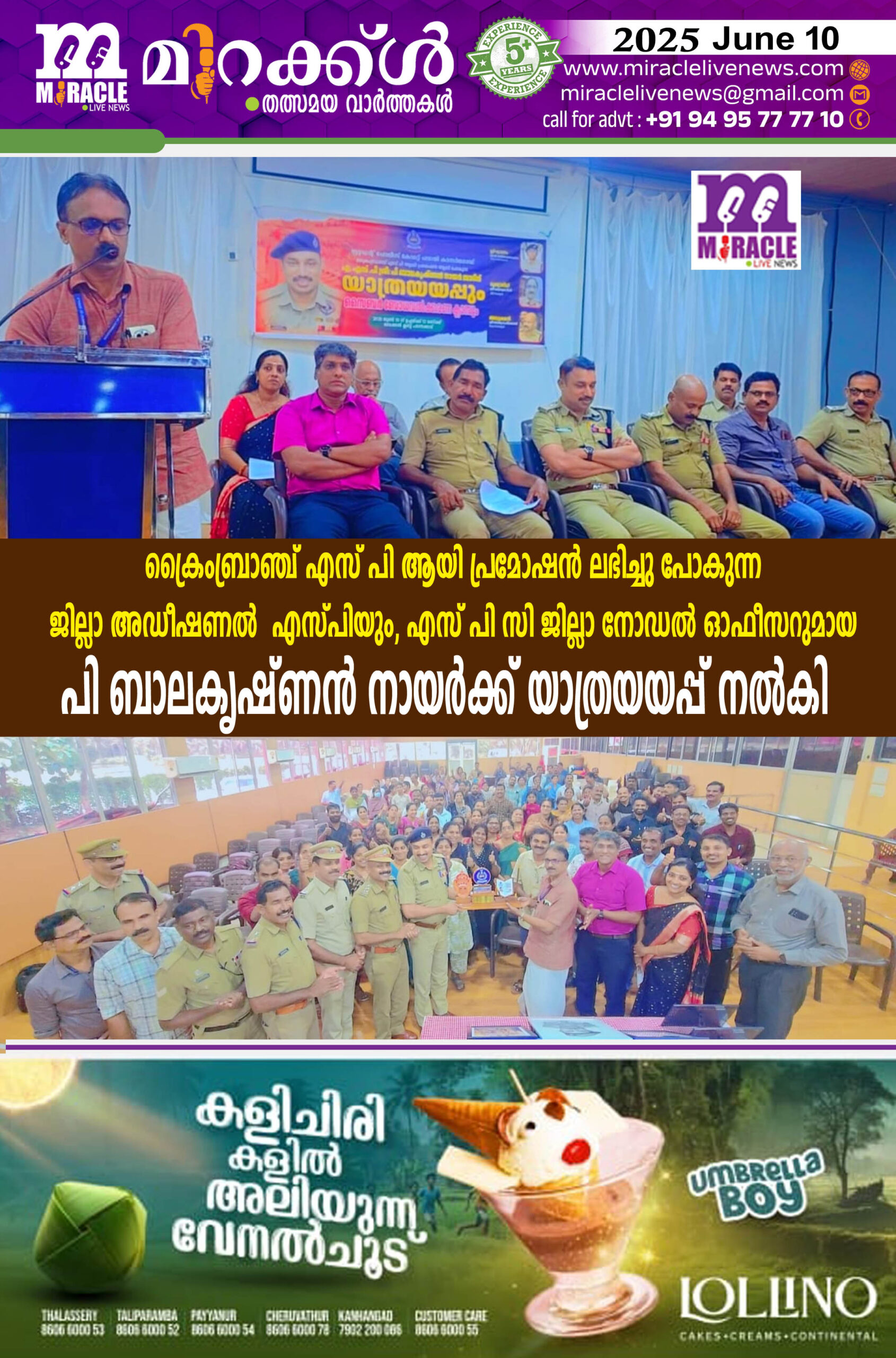 ക്രൈംബ്രാഞ്ച് എസ് പി ആയി പ്രമോഷന് ലഭിച്ചു പോകുന്ന ജില്ലാ അഡീഷണല് എസ്പിയും, എസ് പി സി ജില്ലാ നോഡല് ഓഫീസറുമായ പി ബാലകൃഷ്ണന് നായര്ക്ക് യാത്രയയപ്പ് നല്കി