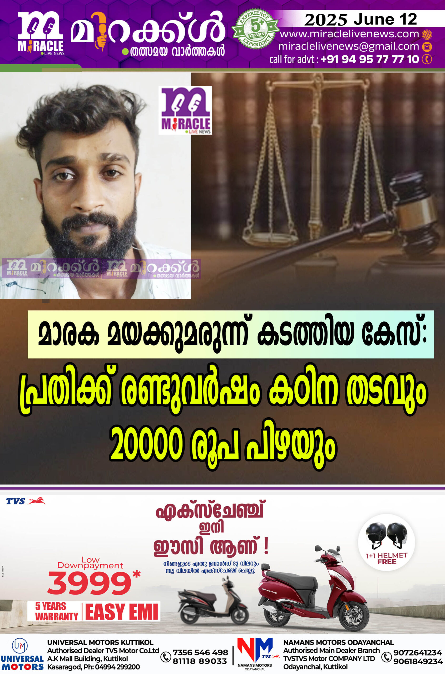 കാസര്കോട്: മാരക മയക്കുമരുന്ന് കടത്തിയ കേസിലെ പ്രതിക്ക് രണ്ടുവര്ഷം കഠിന തടവിനും 20000 രൂപ പിഴയടക്കാനും ശിക്ഷിച്ചു . പിഴയടച്ചി ല്ലെങ്കില് മൂന്നു മാസം അധിക തടവ് കൂടി അനുഭവിക്കണം. കുമ്പള ചെടികാവിലെ മുസ്തഫയുടെ മകന് എം.മുഹമ്മദ് ഹനീഫ് (30) നെയാണ് കാസര് കോട് അഡീഷണല് ഡിസ്ട്രിക്ട് ആന്ഡ് സെഷന്സ് ജഡ്ജ് കെ. പ്രിയ ശിക്ഷ വിധിച്ചത്.