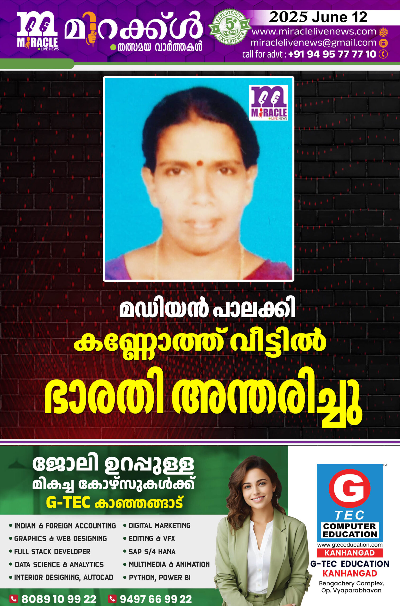 കാഞ്ഞങ്ങാട്: മഡിയന് പാലക്കി കണ്ണോത്ത് വീട്ടില് കെ.ഭാരതി(54) അന്തരിച്ചു. പരേതനായ കണ്ണന്റെയും കെ.കുഞ്ഞിപ്പെ ണ്ണിന്റെയും മകളാണ്.