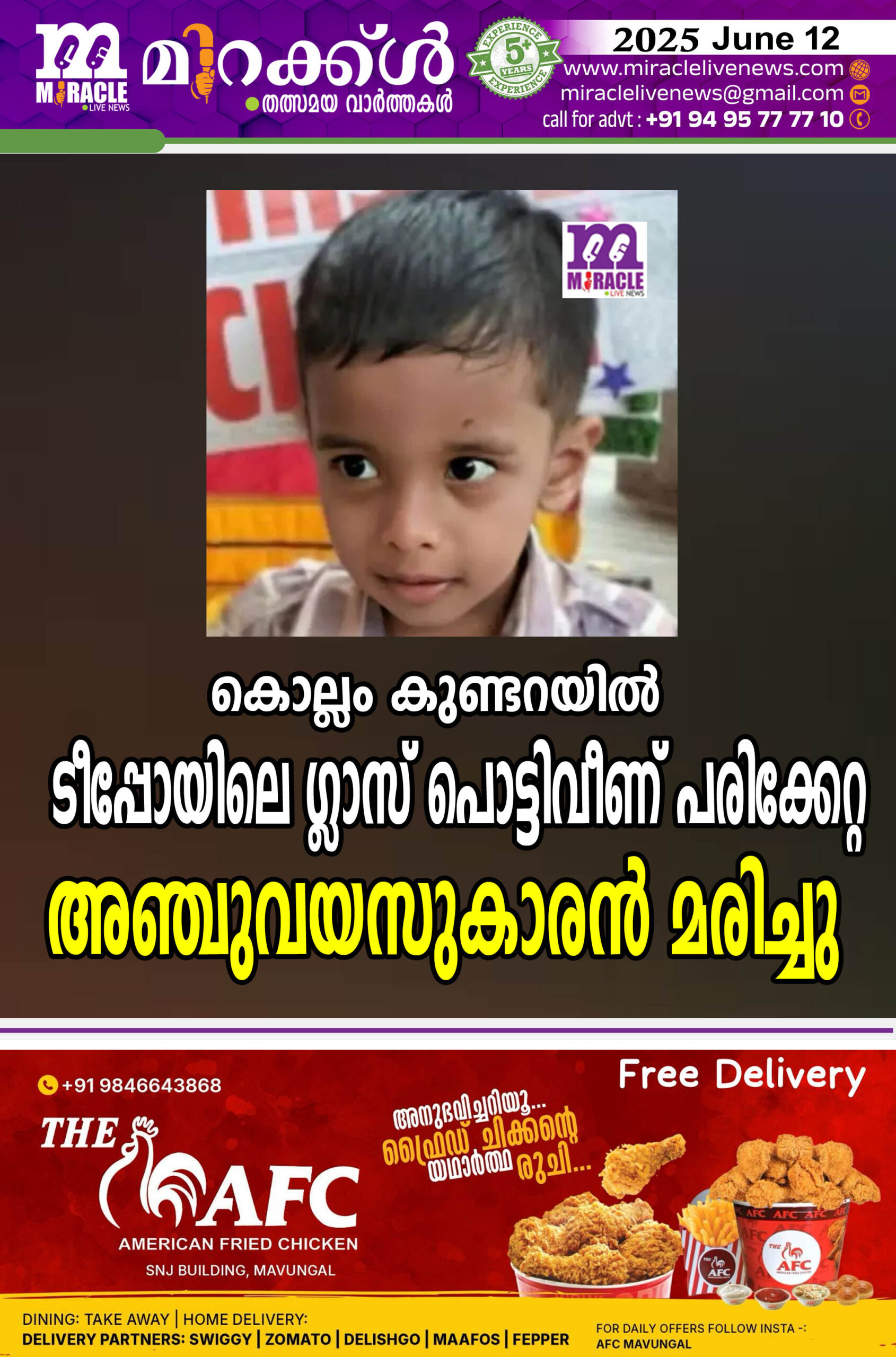 കൊല്ലം കുണ്ടറയില് ടീപ്പോയിലെ ഗ്ലാസ് പൊട്ടിവീണ് പരിക്കേറ്റ അഞ്ചുവയസുകാരന് മരിച്ചു