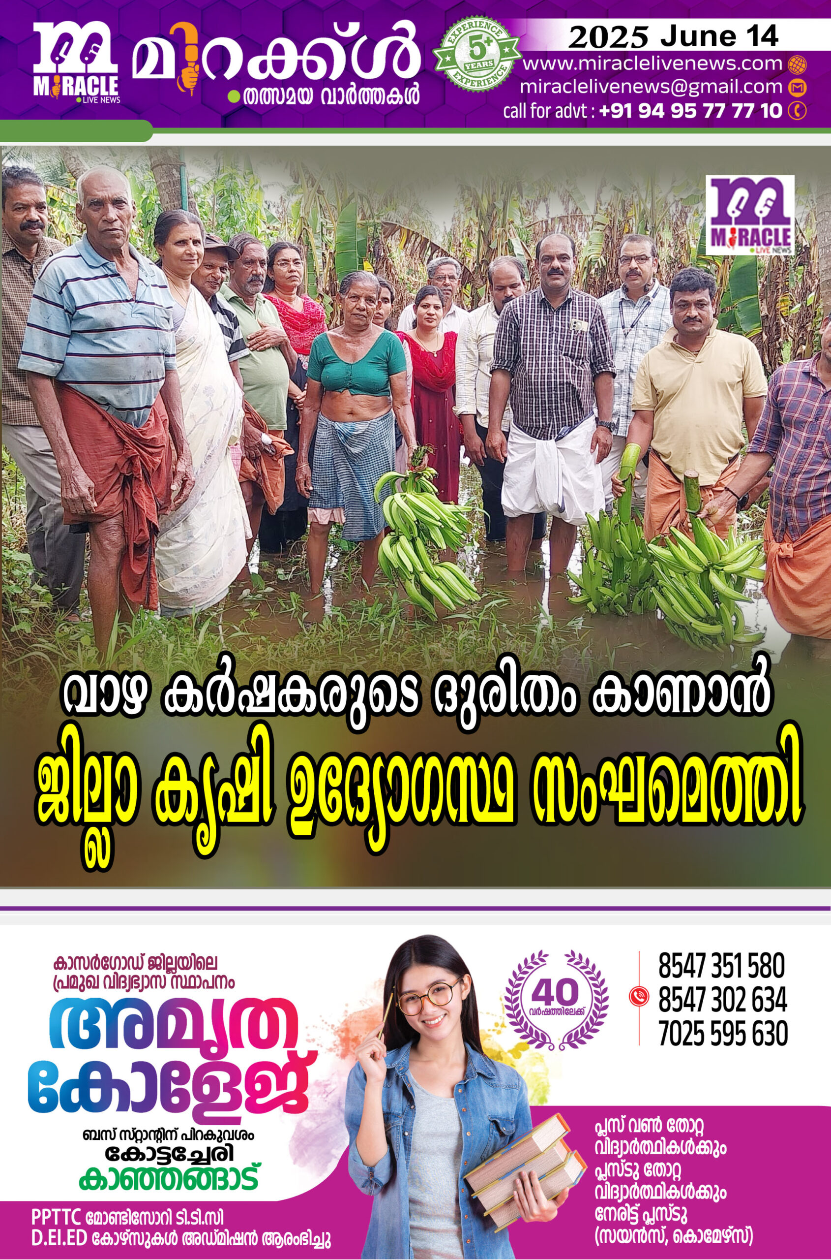 നീലേശ്വരം: നേരത്തേയെത്തിയ കാലവര്‍ഷത്തില്‍ ദുരിതത്തിലായ മടിക്കൈയിലെ നേത്രവാഴ കര്‍ഷകര്‍കരുടെ തോട്ടങ്ങള്‍ ജില്ല കൃഷി ഡെപ്യൂട്ടി ഡയറക്ടറുടെ നേതൃത്വത്തില്‍ സന്ദര്‍ശിച്ചു. ദിവസങ്ങളായി കനത്തുപെയ്ത മഴയിലും കാറ്റിലും വാഴകള്‍ പകുതിയും ഒടിഞ്ഞുവീണെങ്കിലും ബാക്കിയായത് വെള്ളം കെട്ടി നിന്ന് വാഴകള്‍ പഴുത്തുണങ്ങി നിലംപൊത്തുകയാണ്. വെള്ളമിറങ്ങി വെയില്‍ വന്നതോടെയാണ് വാഴകളുടെ ഇലകള്‍ മുഴുവന്‍ പഴുത്ത് വാഴകള്‍ ഒടിഞ്ഞു വീഴാന്‍ തുടങ്ങിയത്. ഇടവേളയ്ക്ക് ശേഷം കാലവര്‍ഷം വീണ്ടുമെത്തിയതോടെ പ്രതീക്ഷകള്‍ മുഴുവന്‍ നഷ്ടമായ കര്‍ഷകര്‍ നിരാശയിലാണ്. കാസര്‍കോടിന്റെ വാഴത്തോട്ടമായ മടിക്കൈ പഞ്ചായത്തിലെ കണിച്ചിറ, മണക്കടവ്, അലൈ കല്ലിങ്കില്‍ എന്നിവിടങ്ങളിലാണ് കൃഷി ഡെപ്യൂട്ടി ഡയറക്ടര്‍ സന്ദര്‍ശനം നടത്തിയത്. ഡെപ്യൂട്ടി ഡയറക്ടര്‍ പി കെ സ്മിതാ നന്ദിനി, എഡിഎ – പി വി ആര്‍ജിത, പഞ്ചായത്ത് പ്രസിഡന്റ് എസ് പ്രീത, വൈസ് പ്രസിഡന്റ് വി പ്രകാശന്‍, വാര്‍ഡ് അംഗങ്ങളായ ടി രാജന്‍, കെ വി പ്രമോദ്, മടിക്കൈ കൃഷി ഓഫീസര്‍ സി പ്രമോദ്കുമാര്‍, കൃഷി അസിസ്റ്റന്റുമാരായ പി വി നിഷാന്ത്, സജിത മണിയറ, സി പി ഐ എം അമ്പലത്തുകര ലോക്കല്‍ സെക്രട്ടറി ഒ കുഞ്ഞികൃഷ്ണന്‍, മടിക്കൈ ലേക്കല്‍ സെക്രട്ടറി കാഞ്ഞിരക്കാല്‍ പ്രഭാകരന്‍ തുടങ്ങിയവരാണ് കൃഷി നാശം സംഭവിച്ച സ്ഥലങ്ങള്‍ സന്ദര്‍ശിച്ചത്.