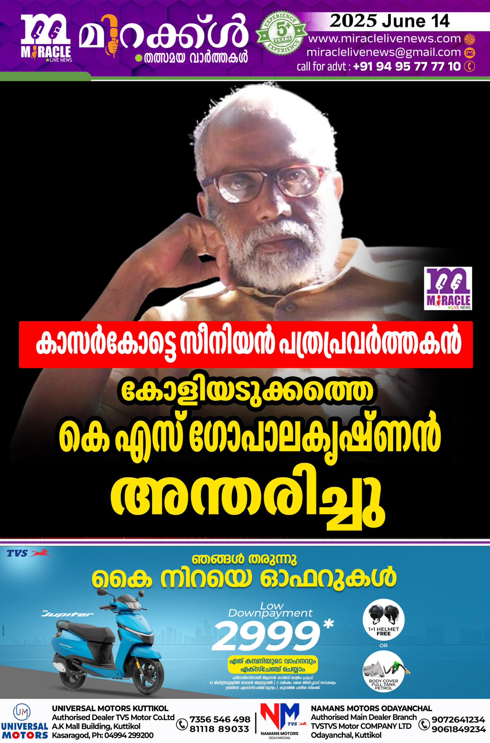 കാസര്കോട്ടെ സീനിയര് പത്രപ്രവര്ത്തകന് കോളിയടുക്കത്തെ കെ എസ് ഗോപാലകൃഷ്ണന് അന്തരിച്ചു