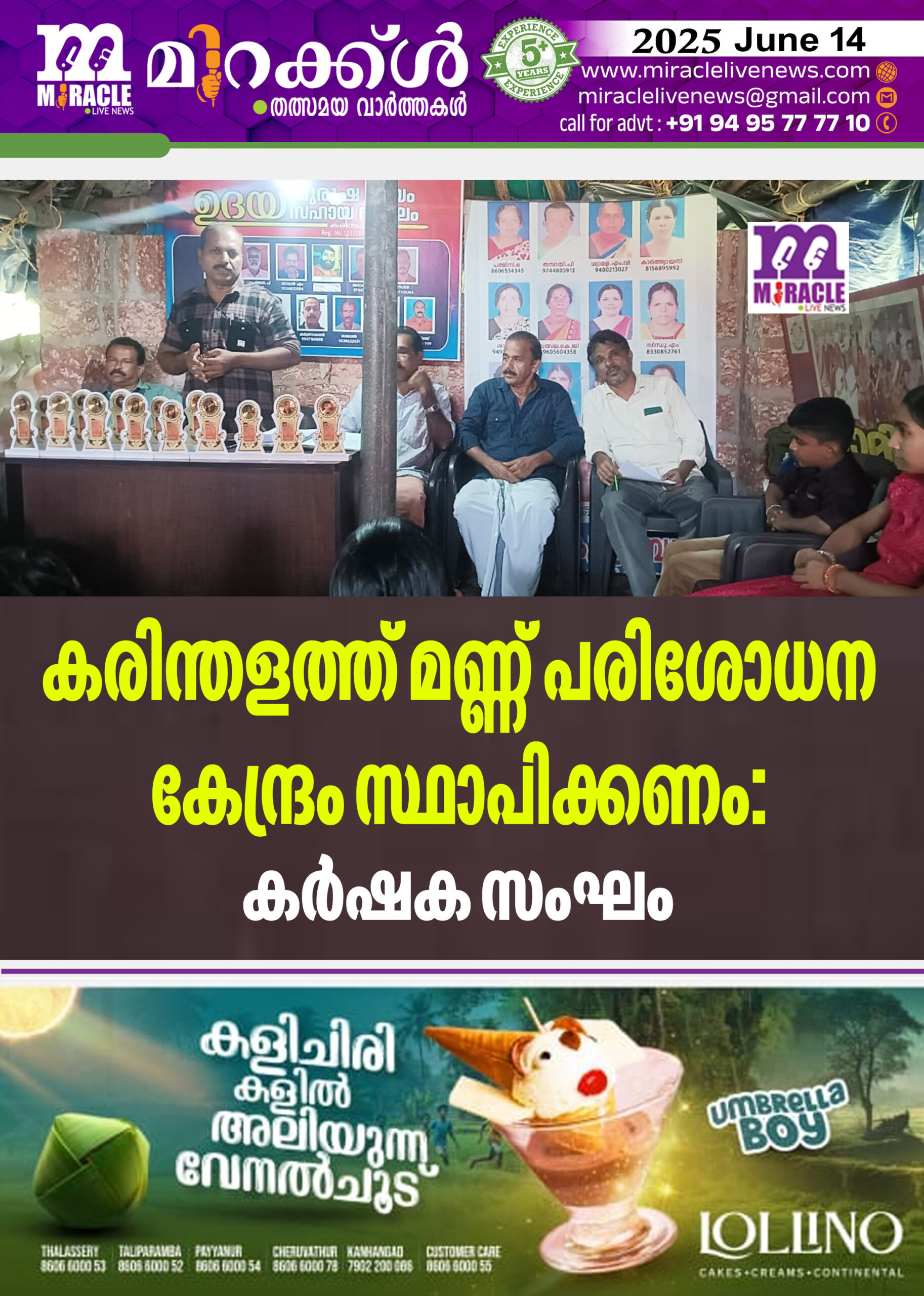 കരിന്തളം: കരിന്തളത്ത് മണ്ണ് പരിശോധന കേന്ദ്രം സ്ഥാപിക്കണമെന്ന് കേരള കര്ഷക സംഘം കരിന്തളം യൂണിറ്റ് സമ്മേളനം അധികൃതരോട് ആവശ്യപ്പെട്ടു.കര്ഷകരെ സംബന്ധിച്ചിടത്തോളം കൃഷി നല്ല രീതിയില് ലാഭകരമായി മുന്നോട്ടു കൊണ്ടു പോകണമെങ്കില് മണ്ണ് പരിശോധന നടത്തി അതിനുതകുന്ന തരത്തിലുള്ള വളപ്രയോഗവും മറ്റും നടത്തിയാല് മാത്രമേ കഴിയുകയുള്ളൂ. മണ്ണിന്റെ ഫലപുഷ്ടി അനുസരിച്ച് വിളകള്ക്ക് ലഭ്യമാകുന്ന സസ്യ പോഷകങ്ങളുടെ അളവ് നിര്ണയിക്കുന്നതിനാണ് മണ്ണ് പരിശോധന നടത്തുന്നത് .നിലവില് ജില്ലയില് കാസര്ഗോഡ് മാത്രമാണ് മണ്ണ് പരിശോധന ലാബ് ഉള്ളത്. യാത്ര ചെയ്യുവാനുള്ള പ്രയാസവും, സാമ്പത്തിക ബാധ്യതയും കാരണം പല കര്ഷകരും മണ്ണ് പരിശോധന നടത്താതെ പാരമ്പര്യ രീതിയില് തന്നെയാണ് കൃഷി ചെയ്തു വരുന്നത്.ഇതിനാല് കര്ഷകര്ക്ക് വലിയ നഷ്ടമാണ് പലപ്പോഴും ഉണ്ടാവുന്നത്. സഞ്ചരിക്കുന്ന മണ്ണ് പരിശോധന ലാബ് ഉണ്ടെങ്കിലും കണ്ണൂര് കാസര്ഗോഡ് ജില്ലകള്ക്കായി ഒന്ന് മാത്രമാണ് ഉള്ളത്.അതിനാല് ഇവയുടെ പ്രയോജനവും കര്ഷകര്ക്ക് വേണ്ട രീതിയില് ലഭിക്കാത്ത സ്ഥിതിയാണ്. അതുകൊണ്ട് മലയോര മേഖലയിലെ മുഴുവന് കര്ഷകര്ക്കും ഉപകാരപ്രദമാകും വിധം മണ്ണ് പരിശോധന കേന്ദ്രം കരിന്തളത്ത് സ്ഥാപിക്കുന്നതിനാവശ്യമായ നടപടികള് സ്വീകരിക്കണമെന്ന് സമ്മേളനം ആവശ്യപ്പെട്ടു.