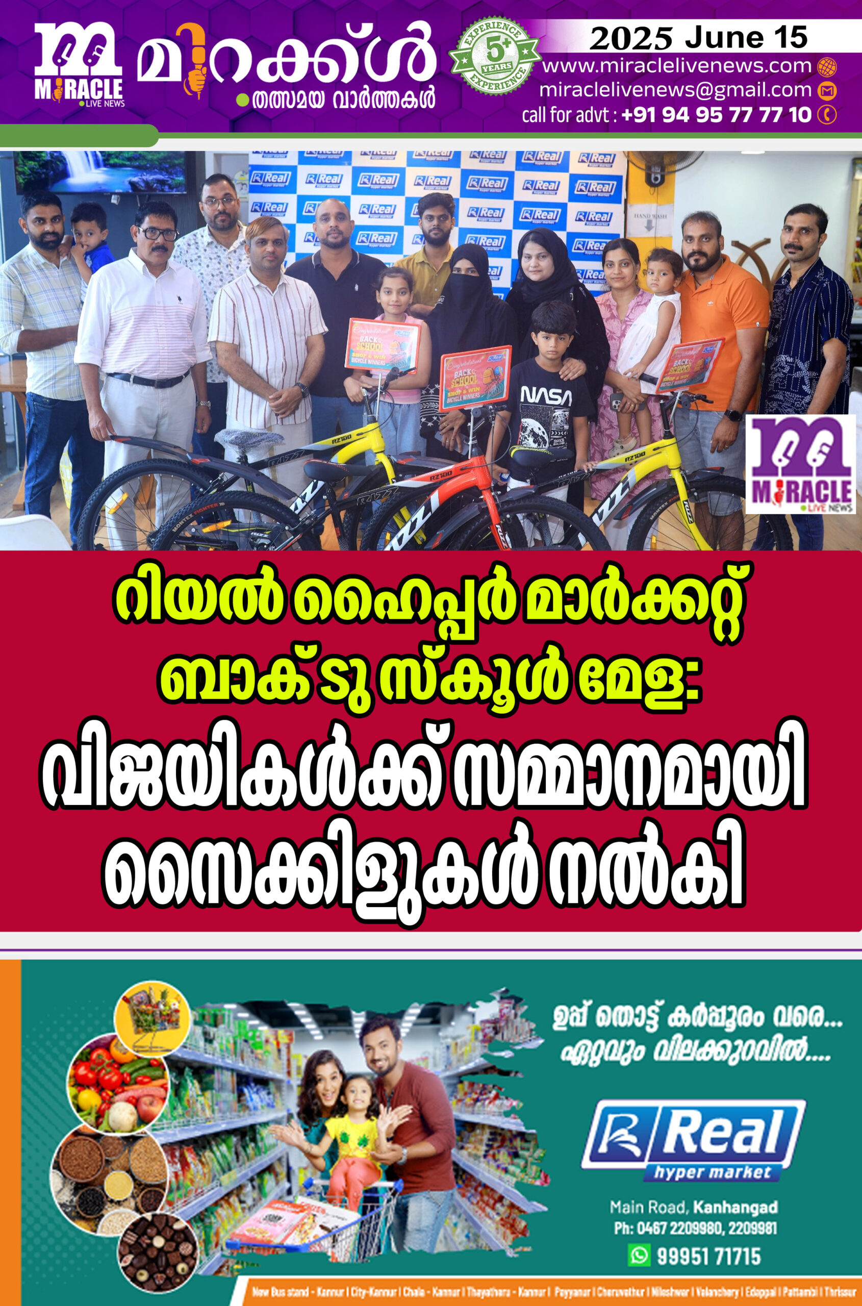 കാഞ്ഞങ്ങാട് : റിയല്‍ ഹൈപ്പര്‍ മാര്‍ക്കറ്റുകളില്‍ നടന്ന ബാക് ടു സ്‌കൂള്‍ മേളയിലെ വിജയികള്‍ക്ക് സമ്മാനമായി സൈക്കിളുകള്‍ നല്‍കി.