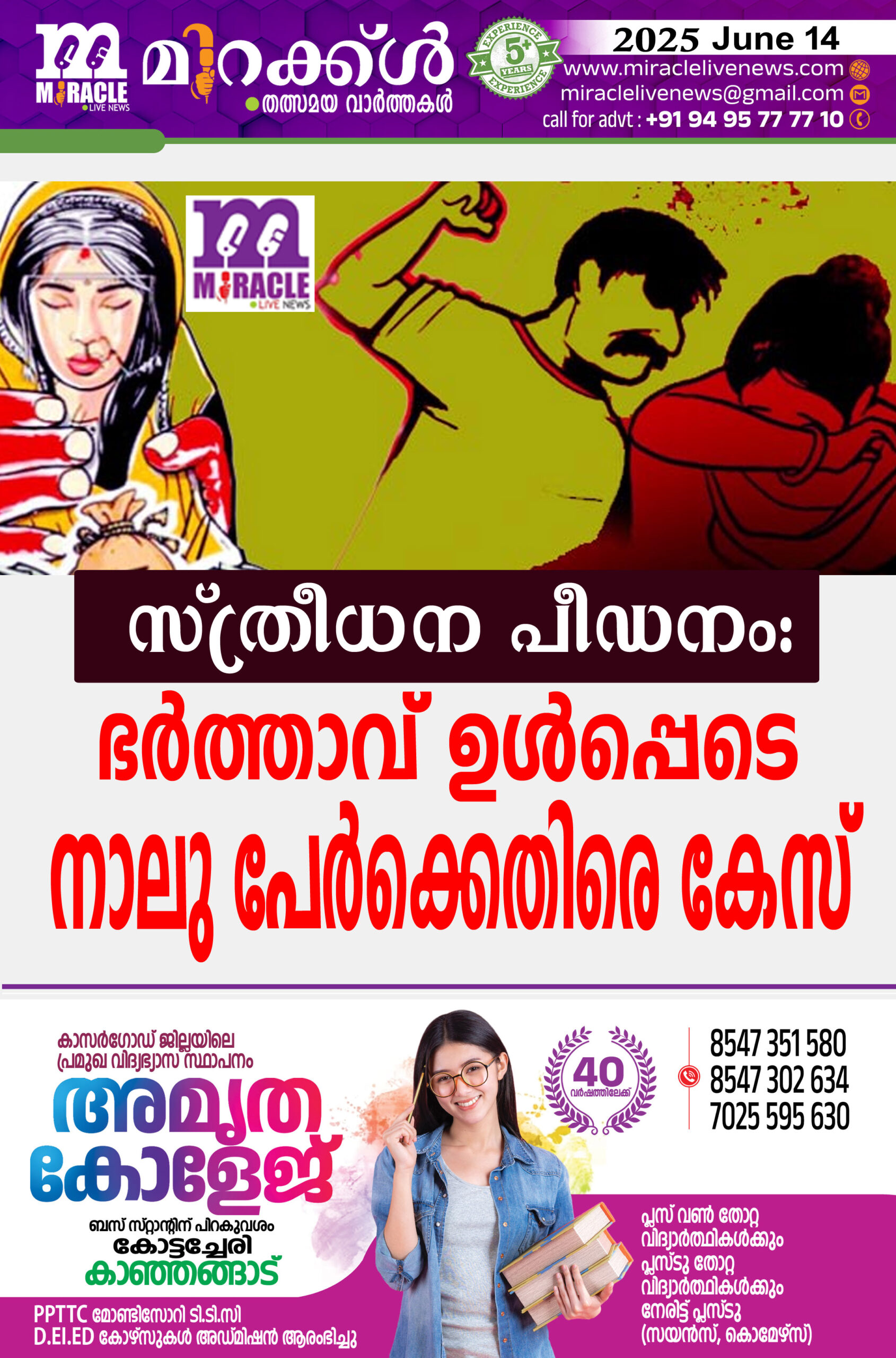 കാഞ്ഞങ്ങാട് : സ്ത്രീധനമായി കൂടുതല് സ്വര്ണവും പണവും ആവശ്യപ്പെട്ട് ശാരീരികമായും മാനസികമായും പീഡിപ്പിച്ചുവെന്ന യുവതിയുടെ പരാതിയില് ഭര്ത്താവ് ഉള്പ്പെടെ നാലു പേര്ക്കെതിരെ കേസ്. പടന്നക്കാട് ദാറുല് അമീന് ഹൗസില് താമസിക്കുന്ന സി കെ സാജിത (44) യുടെ പരാതിയില് ഭാര്ത്താവ് ബല്ലാ കടപ്പുറത്തെ എം. കെ.ഹംസ , ഭര്തൃ മാതാവ് ആയിഷ, സഹോദരങ്ങളായ ഫാത്തിമ, സുബൈര് മുഹമ്മദ് എന്നിവര്ക്ക് എതിരെയാണ് കേസ്.