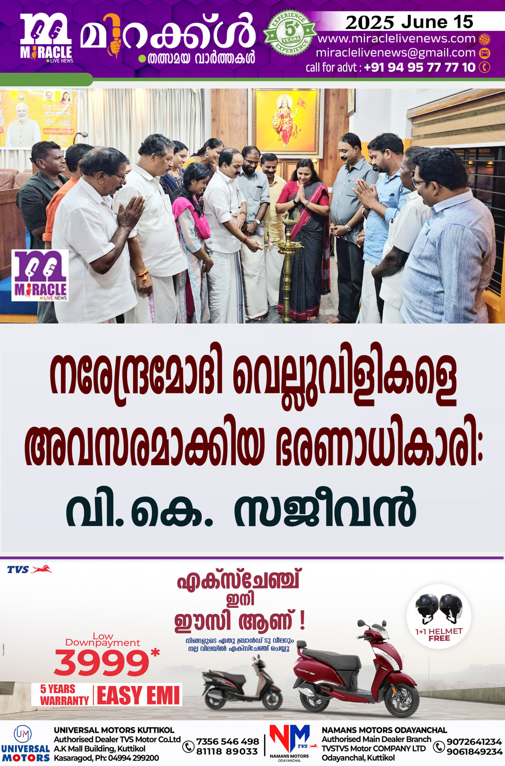 കാസര്കോട് : കോവിഡ് കാലത്ത് ആരോഗ്യ – ഭക്ഷ്യവിതരണ രംഗത്തുണ്ടായ വെല്ലുവിളികളെ പോലും വികസനത്തിനും സ്വയംപര്യാപ്തത കൈവരിക്കാനുമുള്ള അവസരമാക്കിയ ഭരണാധികാരിയാണ് നരേന്ദ്രമോദിയെന്ന് ബിജെപി മുന് സംസ്ഥാന സെക്രട്ടറി വി.കെ. സജീവന് പറഞ്ഞു. നരേന്ദ്ര മോദി സര്ക്കാരിന്റെ 11-ാം വാര്ഷികത്തോടനുബന്ധിച്ച് ബിജെപി കാസര്ഗോഡ് ജില്ലാ ഘടകം സംഘടിപ്പിച്ച സങ്കല്പ്പ് സെ സിദ്ധി ജില്ലാ ശില്പ്പശാല ഉദ്ഘാടനം ചെയ്യുകയായിരുന്നു അദ്ദേഹം.