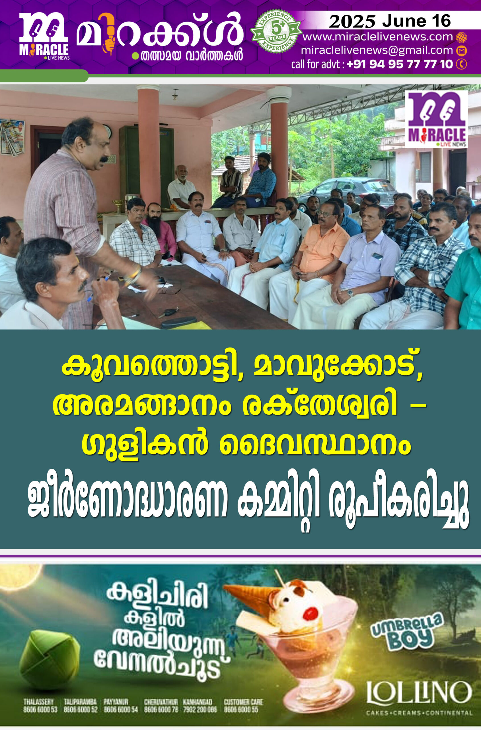 സംസാരിച്ചു. ആറു മാസം കൊണ്ട് എല്ലാ നവീകരണ പ്രവര്ത്തനങ്ങള് നടത്തുവാന് യോഗത്തില് തീരുമാനിച്ചു. ജീര്ണോദ്ധാരണ കമ്മിറ്റിയും മാതൃ സമിതിയും രൂപീകരിച്ചു. കമ്മിറ്റി ഭാരവാഹികള് രക്ഷാധികാരികള്: പി വി ജയരാജന് മാഷ്, എം കണ്ണന് കുന്നുമ്മല്, കണ്ണന് മേസ്തിരി ഉലൂജി,