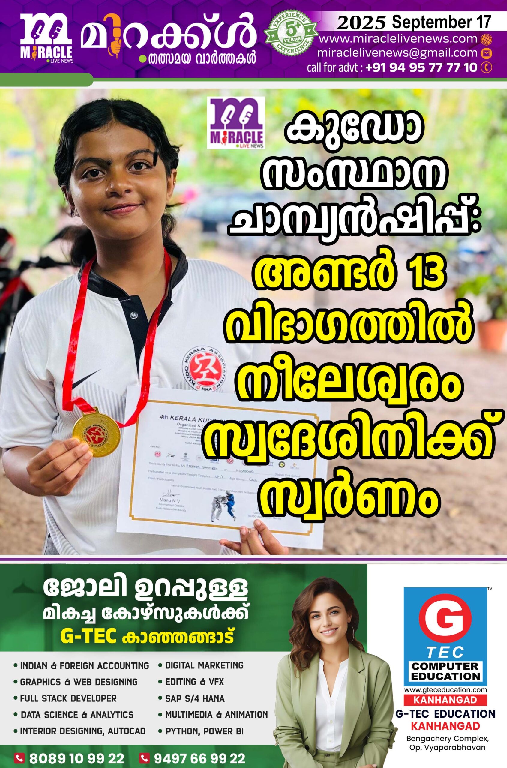 കുഡോ സംസ്ഥാന ചാമ്പ്യന്ഷിപ്പ്: അണ്ടര് 13 വിഭാഗത്തില് നീലേശ്വരം സ്വദേശിനിക്ക് സ്വര്ണം