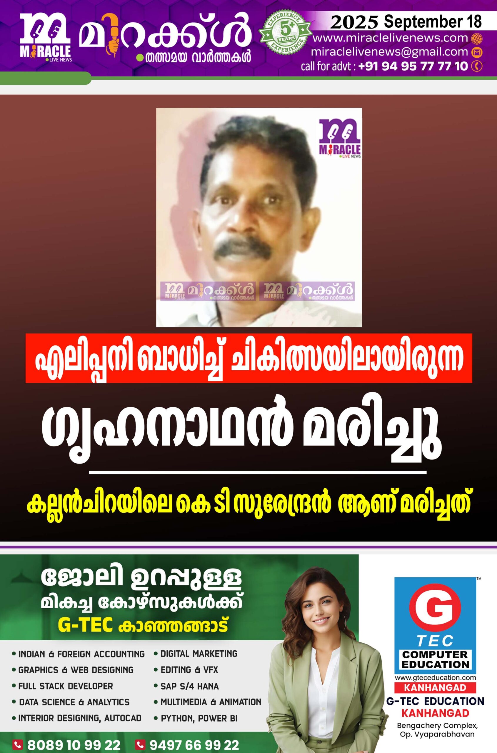 എലിപ്പനി ബാധിച്ച് ചികിത്സയിലായിരുന്ന ഗൃഹനാഥന്‍ മരിച്ചു; കല്ലന്‍ചിറയിലെ കെ ടി സുരേന്ദ്രന്‍ ആണ് മരിച്ചത്