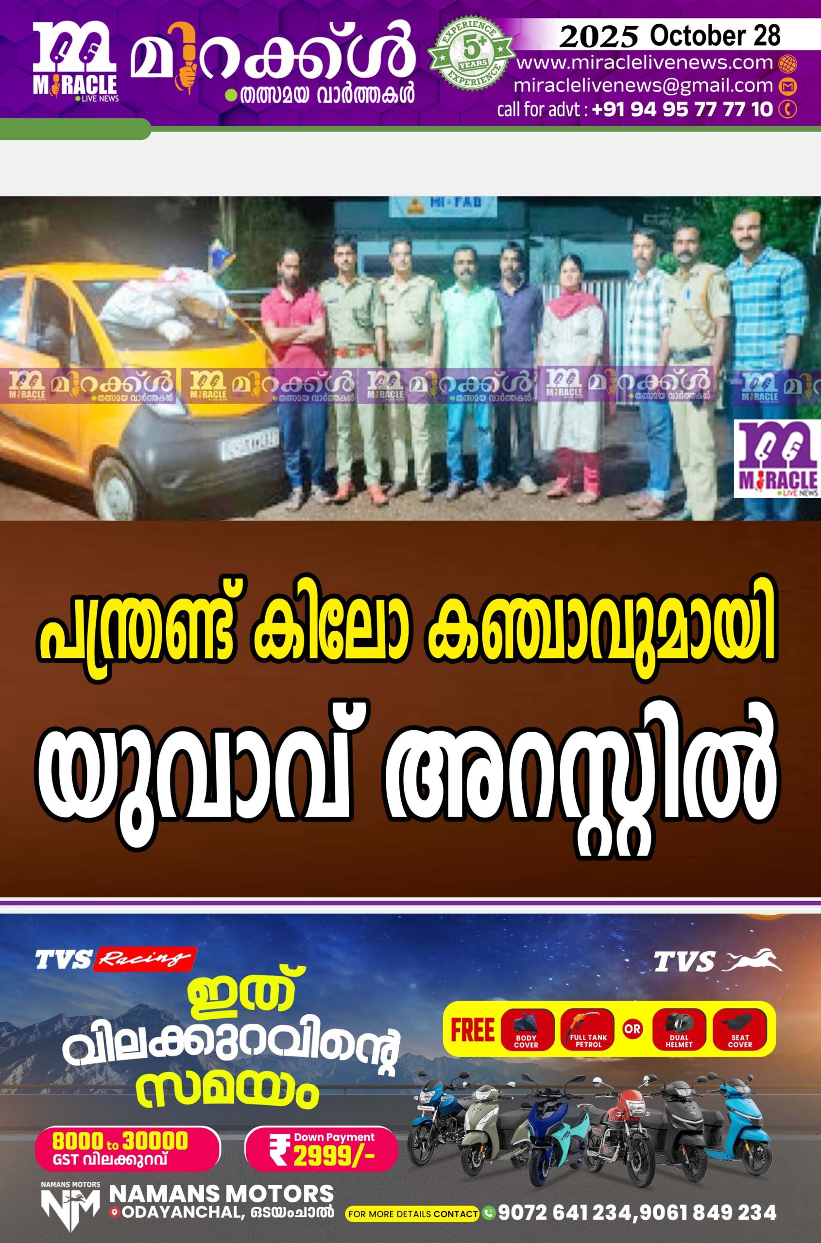 തിങ്കളാഴ്ച രാത്രിയില് എക്സൈസ് സംഘം നടത്തിയ റെയ്ഡില് വീട്ടിലെ കിടപ്പുമുറിയിലെ കട്ടിലിനടിയില് നിന്നും 5.269 കിലോ ഗ്രാം കഞ്ചാവും വീടിന്റെ മുന്വശം നിര്ത്തിയിട്ട പ്രതിയുടെ ജെ. എച്ച്.05 എ.എന്. 2837 നമ്പര് ടാറ്റ നാനോ കാറില് നിന്നും 6.5 കിലോ ഗ്രാം കഞ്ചാവും ഉള്പ്പെടെ 11.769 കിലോഗ്രാം കഞ്ചാവ് എക്സൈസ് സംഘം പിടികൂടി. റെയ്ഡില് ഗ്രേഡ് അസിസ്റ്റന്റ് എക്സൈസ് ഇന്സ്പെക്ടര്മാരായ ശ്രീനിവാസന് പത്തില്,സി കെ വി സുരേഷ്, ഗ്രേഡ് പ്രിവന്റീവ് ഓ ഫീ സര്മാരായ അജീഷ് സി,പ്രജിത്ത് കെ ആര്, സിവില് എക് സൈസ് ഓഫീസര്മാരായ സോനു സെബാസ്റ്റ്യന്,ഷിജിത്ത് വി. വി,വനിത സിവില് എക്സൈസ് ഓഫീസര് ധന്യ ടി.വി .സിവില് എക്സൈസ് ഓഫീസര് ഡ്രൈവര് ക്രിസ്റ്റിന് പി എ എന്നിവരും ഉണ്ടാ യിരുന്നു. കഞ്ചാവ് കേസില് പ്രതി മുമ്പ് ജയില്വാസം അ നുഭവിച്ചിട്ടുണ്ട്.