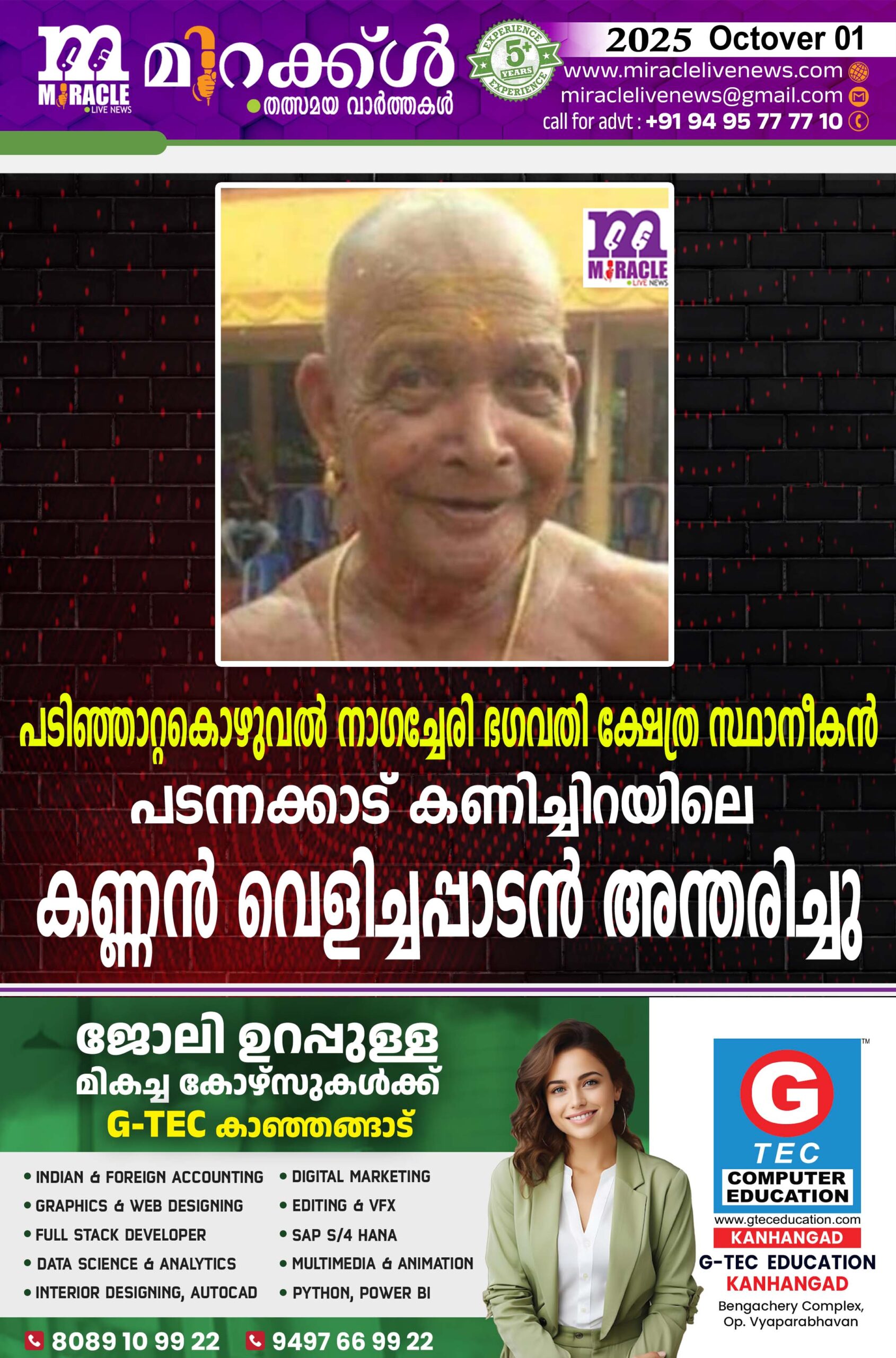 പടിഞ്ഞാറ്റകൊഴുവല് നാഗച്ചേരി ഭഗവതി ക്ഷേത്ര സ്ഥാനീകന് പടന്നക്കാട് കണിച്ചിറയിലെ കണ്ണന് വെളിച്ചപ്പാടന് അന്തരിച്ചു
