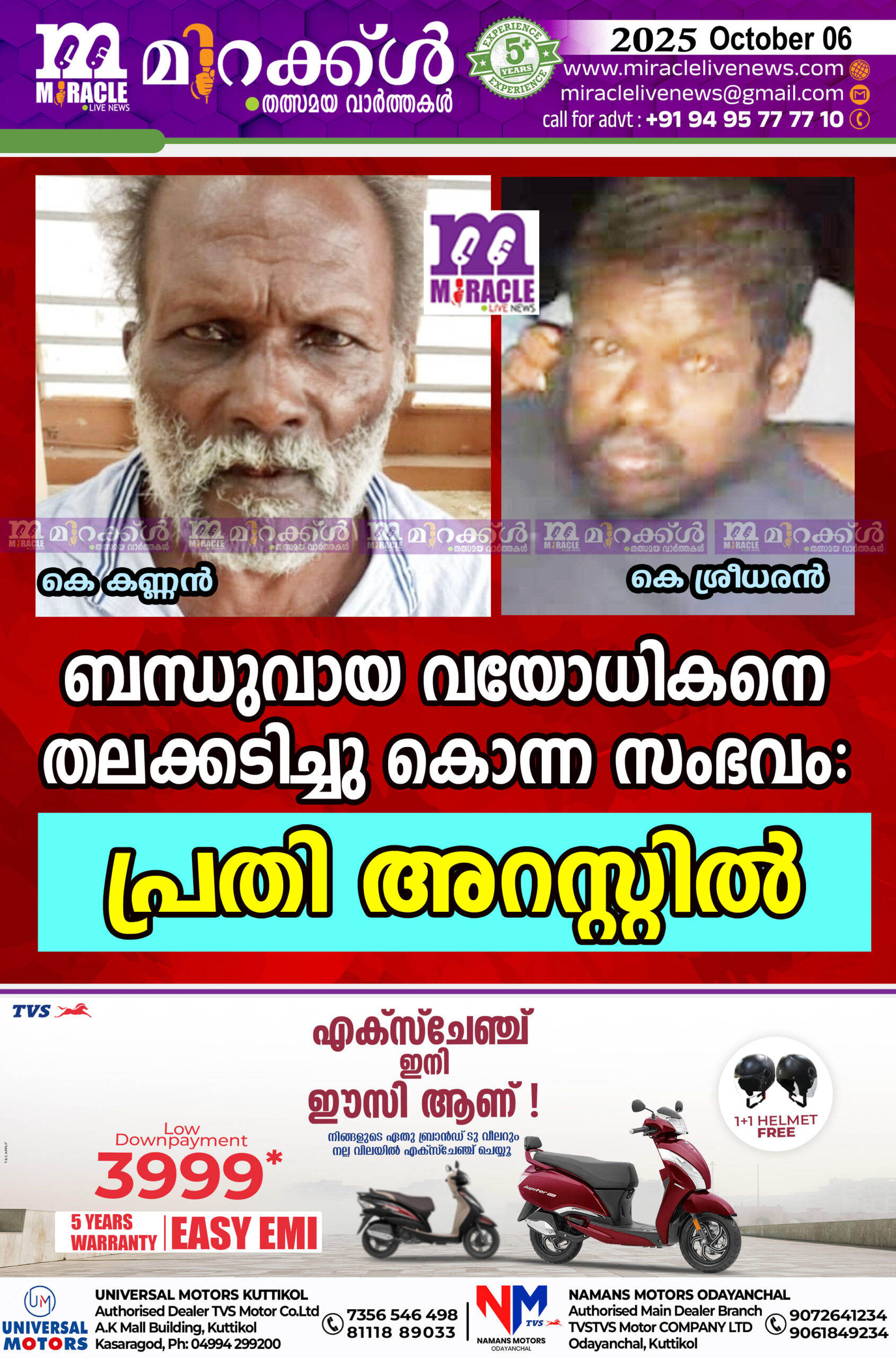 അയല്വാസിയും ബന്ധുവുമായ കെ ശ്രീധരന് (44) തലക്കടിച്ച് കൊലപ്പെടുത്തിയത്. ശ്രീധരനെ നീലേശ്വരം പോലീസ് നാട്ടുകാരുടെ സഹായത്തോടെ കസ്റ്റഡിയിലെടുത്തു. ഞായാഴ്ച്ച വൈകിട്ടാണ് സംഭവം. കണ്ണനെ വീട്ടില് ചെന്നാണ് ശ്രീധരന് വടി കൊണ്ട് തലക്കടിച്ച് വീഴ്ത്തിയത്. ഉടന് ആശുപത്രിയിലേക്ക് കൊണ്ടു പോയെങ്കിലും വഴി മദ്ധ്യേ മരണപ്പെട്ടു. സംഭവറിഞ്ഞു കാഞ്ഞങ്ങാട് ഡിവൈഎസ്പി സി കെ സുനില് കുമാര്, നീലേശ്വരം പോലീസ് ഇന്സ്പെക്ടര് നിബിന് ജോയ് എന്നിവര് സ്ഥലത്തെത്തി. പുത്തരിച്ചിയാണ് മരണപ്പെട്ട കണ്ണന്റെ ഭാര്യ. മക്കള്: ശശി, ചന്ദ്രന്, ജയന് (മുവരും കുമ്പളപ്പള്ളി ).മരുമക്കള്: രാധാമണി (ഇടത്തോട്),ബേബി (കുമ്പളപ്പള്ളി ) ,രമ്യ (ബേത്തൂര്പാറ). സഹോദരങ്ങള്: ശാരദ (കാറളം പാലക്കുന്ന്), പരേതരായ വെളുത്തന്, മാണിക്യന്. പ്രതിയെ