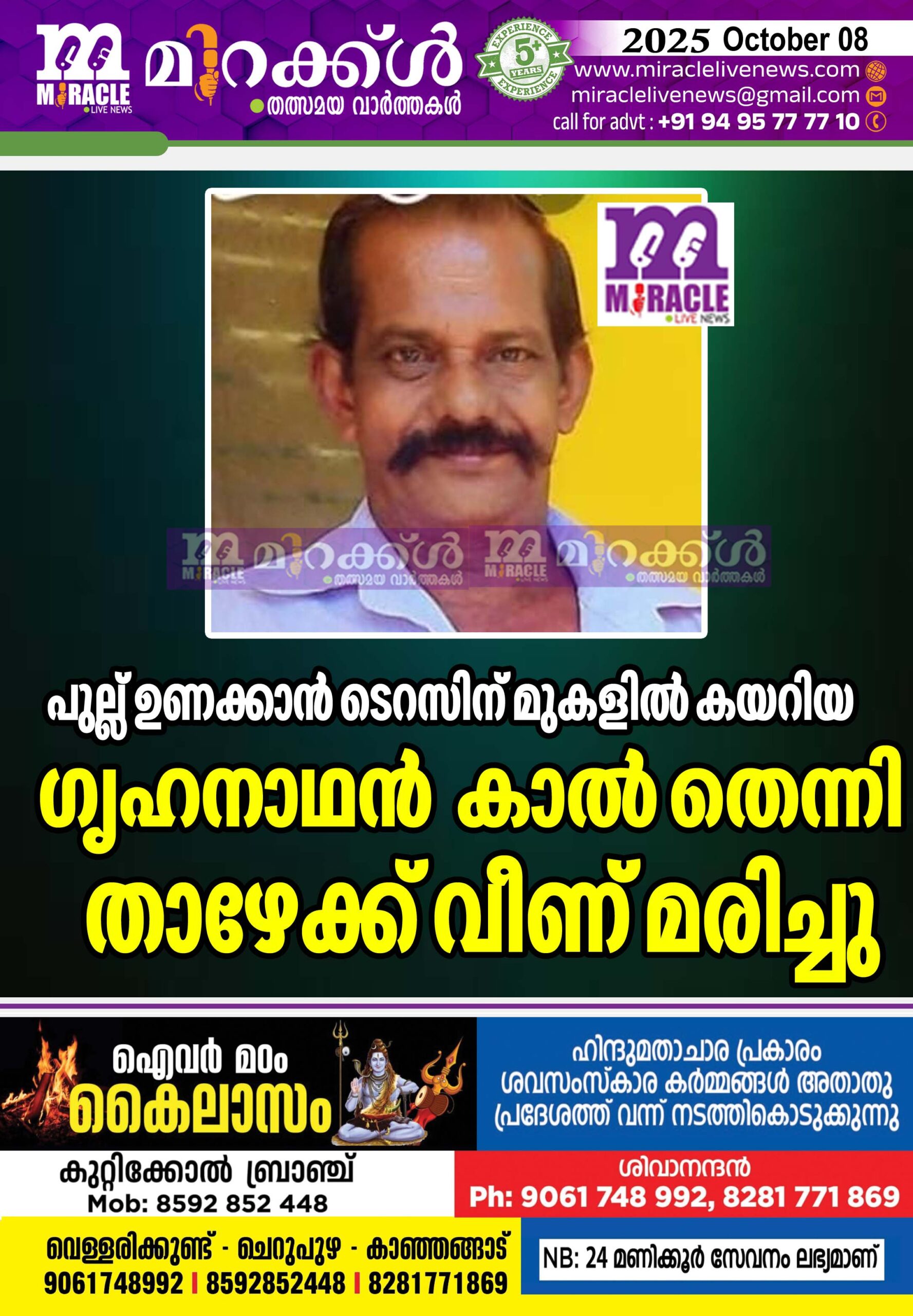 പുല്ല് ഉണക്കാന് ടെറസിന് മുകളില് കയറിയ ഗൃഹനാഥന് കാല് തെന്നി താഴേക്ക് വീണ് മരിച്ചു