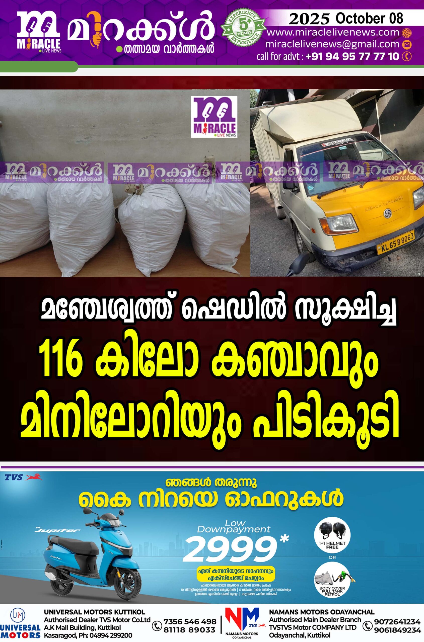 കാസര്കോട്: ഷെഡില് സൂക്ഷിച്ച 116കിലോ കഞ്ചാവും കെ എല് 65 ബി 8063 നമ്പര് മിനിലോറിയും പിടികൂടി.