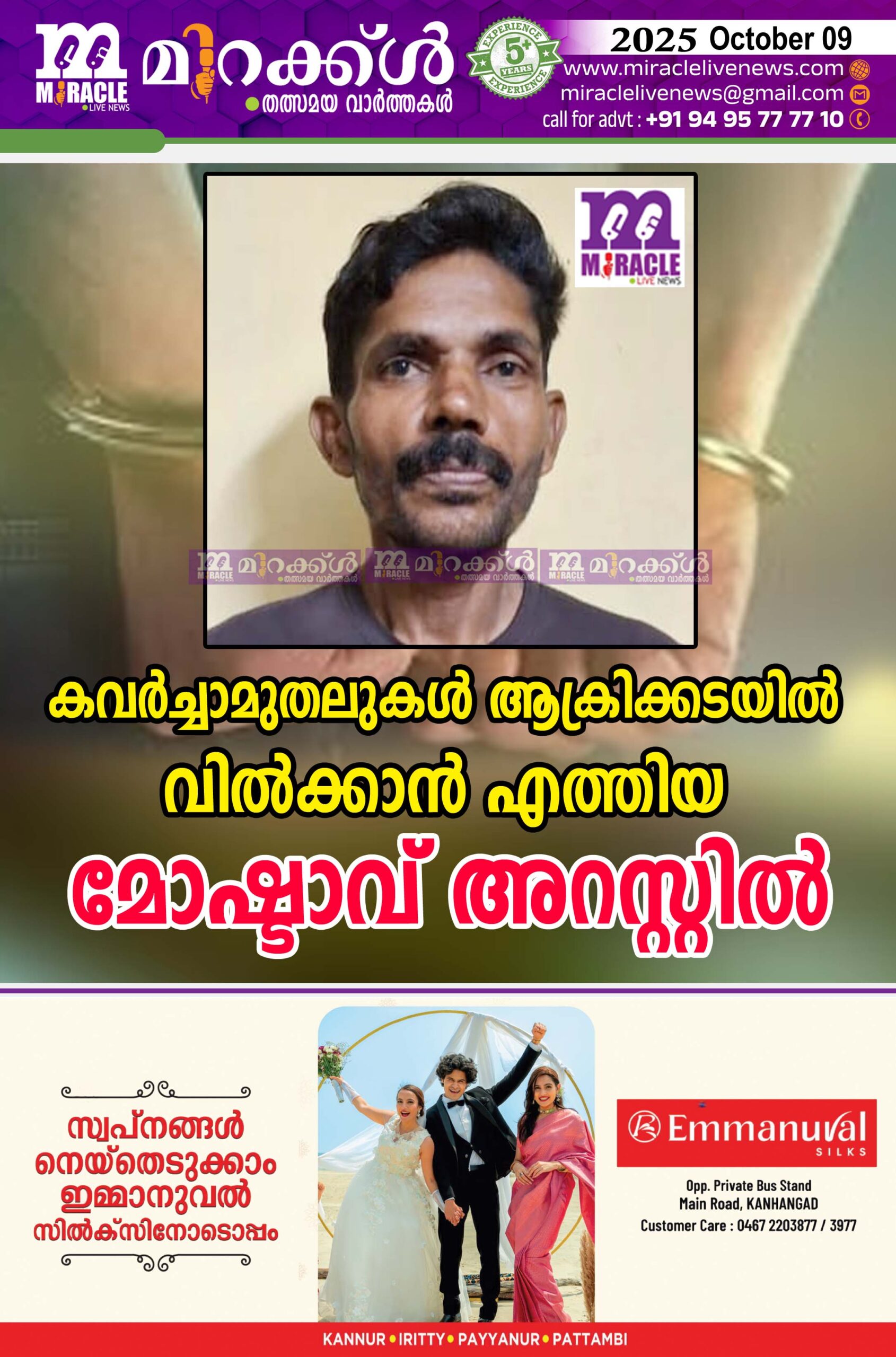 കാഞ്ഞങ്ങാട് : കവര്ച്ചാമുതലുകള് ആക്രിക്കടയില് വില്ക്കാന് എത്തിയ മോഷ്ടാവ് അറസ്റ്റില്. കല്ലംചിറ, പുതുക്കാല് അച്ചി മേലമ്മ ദേവസ്ഥാനത്ത് നിന്നു വിളക്കുകളും മണികളും പണവും കവര്ന്ന കേസിലെ പ്രതി പയ്യന്നൂര്, രാമന്തളി, കുരിശുമുക്കിലെ പി വി .പ്രകാശന് (47)നെയാണ് ഹോസ്ദുര്ഗ് എസ്. ഐ. എ. ആര്. ശാര്ങ്ധരന് അറസ്റ്റ് ചെയ്തത്. കഴിഞ്ഞ ശനിയാഴ്ച രാത്രിയാണ് ദേവസ്ഥാനത്ത് നിന്ന് രണ്ട് വലിയ മണികള്, ആറ് തൂക്കുവിളക്കുകള്, കൈമണി, കൊടിവിളക്ക്, തളിക എന്നിവ മോഷണം പോയത്. ഭണ്ഡാരം കുത്തിത്തുറന്ന് പണവും മോഷ്ടിച്ചിരുന്നു. ഞായറാഴ്ച രാവിലെയാണ് സംഭവം പുറത്തറിഞ്ഞത്. ദേവസ്ഥാനം സെക്രട്ടറി കുശാല് നഗറിലെ സി രാജീവന് ഹോസ്ദുര്ഗ് പോലീസില് പരാതി നല്കിയിരുന്നു. കേസെടുത്ത പോലീസ് ആക്രിക്കടകള് നിരീക്ഷണത്തിലാക്കുകയും കവര്ച്ചാ മുതലുകള് വില്ക്കാന് എത്തിയപ്പോള് കയ്യോടെ പിടികൂടുകയുമായിരുന്നു.