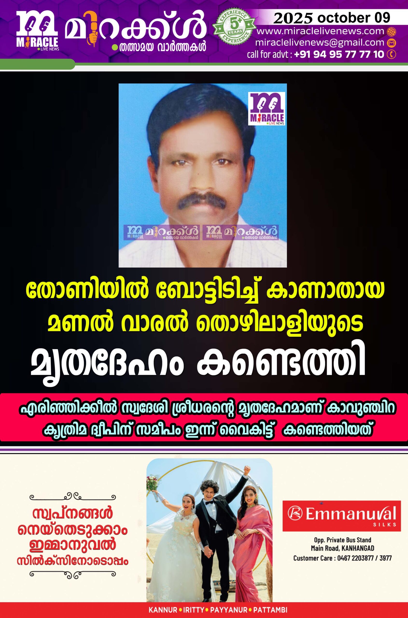 തോണിയില്‍ ബോട്ടിടിച്ച് കാണാതായ മണല്‍ വാരല്‍ തൊഴിലാളിയുടെ മൃതദേഹം കണ്ടെത്തി ; എരിഞ്ഞിക്കീല്‍ സ്വദേശി ശ്രീധരന്റെ മൃതദേഹമാണ് .കാവുഞ്ചിറ കൃത്രിമ ദ്വീപിന് സമീപം ഇന്ന് വൈകിട്ട് കണ്ടെത്തിയത്