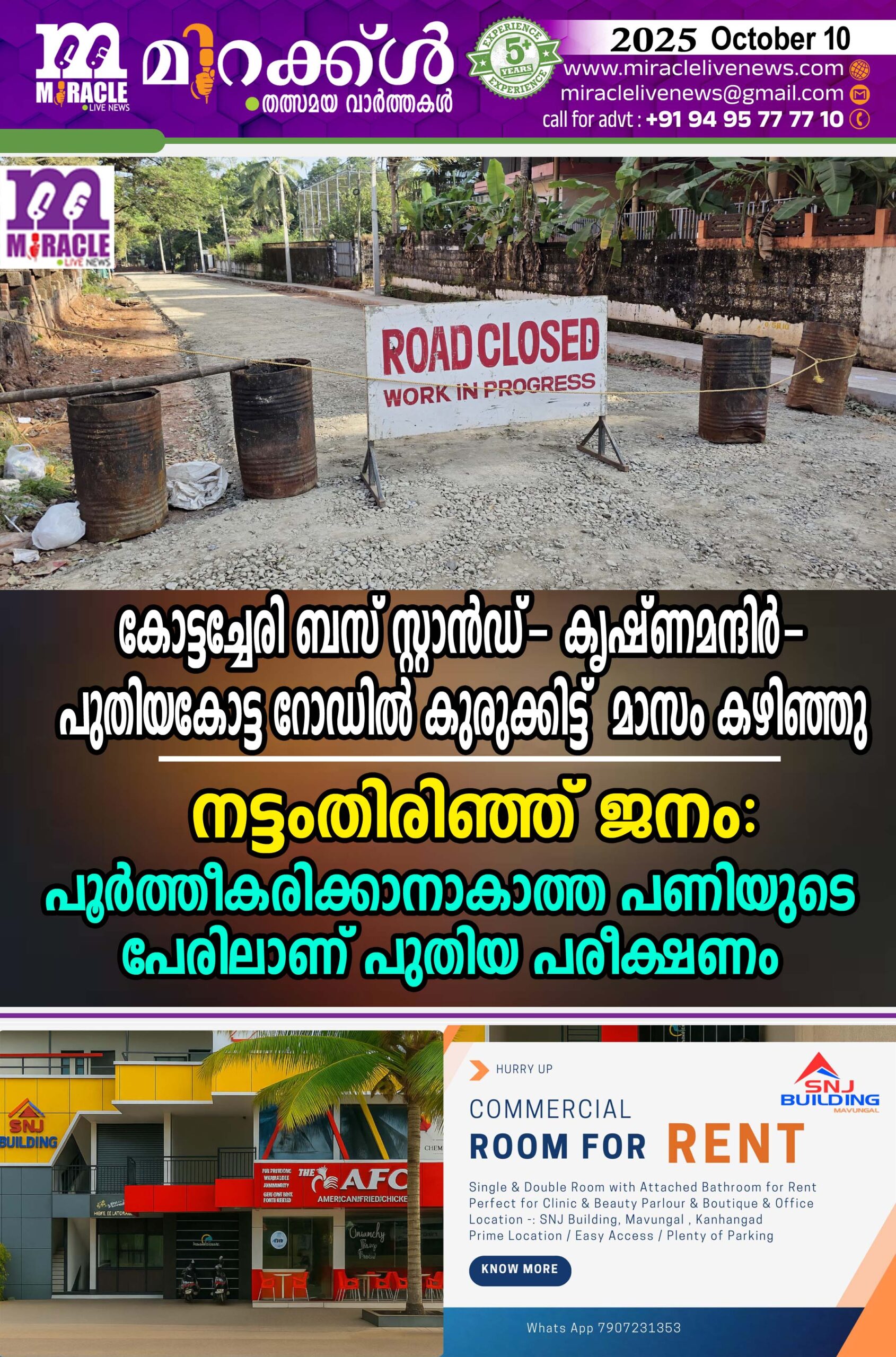 കോട്ടച്ചേരി- കൃഷ്ണമന്ദിര്- പുതിയകോട്ട റോഡില് ഗ്രോടെക് മുതല് പുതിയകോട്ട ഇന്ഡസ് ജംഗ്ഷന് വരെയുള്ള ഭാഗം ഇനിയും തീരാത്ത കോണ്ക്രീറ്റിങ്ങിനായി അറ്റകുറ്റപ്പണിക്കായി കഴിഞ്ഞ ഏഴു മാസത്തോളമായി റോഡ് അടച്ചിട്ടിട്ട് പണി തീര്ക്കുന്നതിന് ഇനിയും ഒരു മാസം വേണമെന്നാണ് പറയുന്നത്.